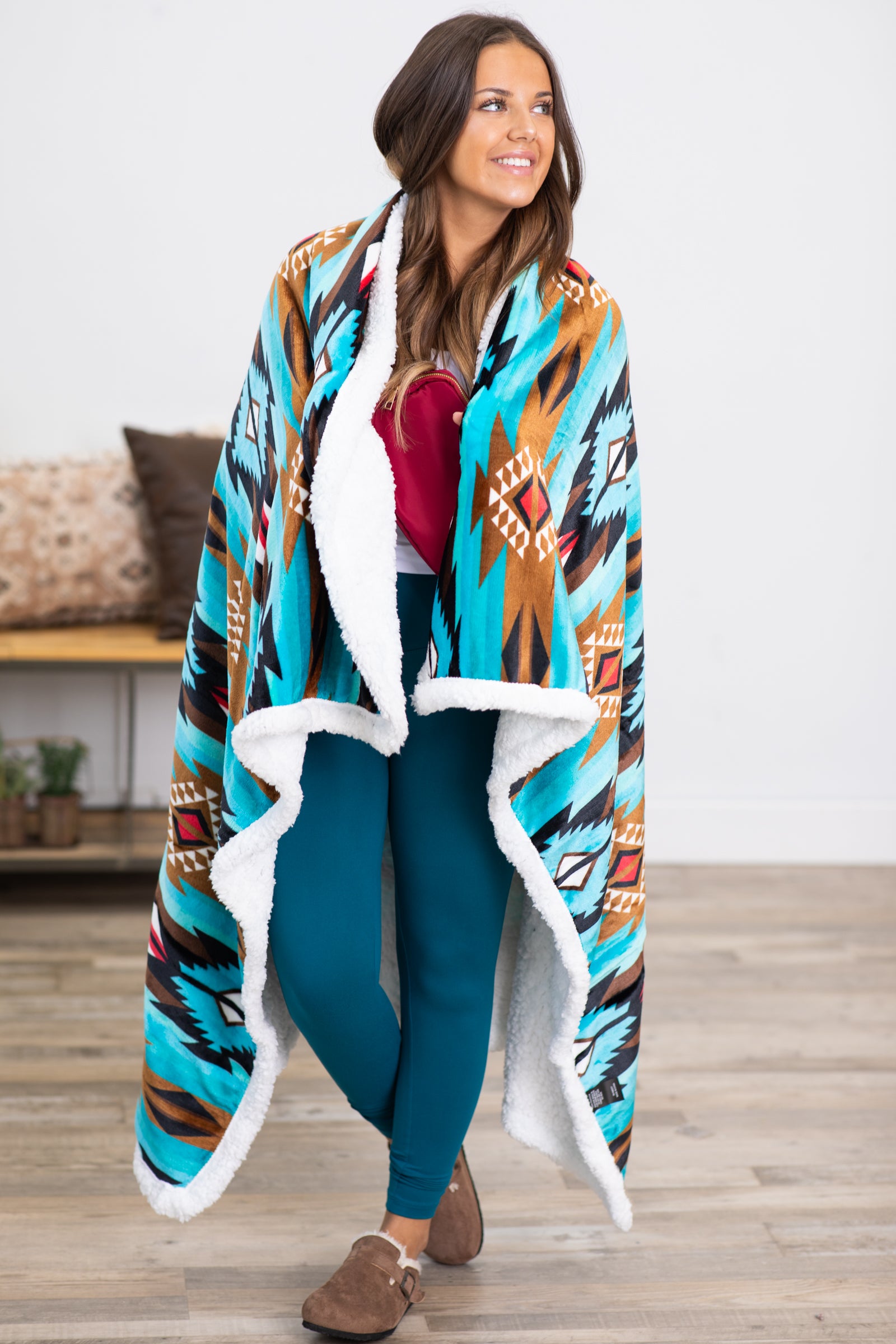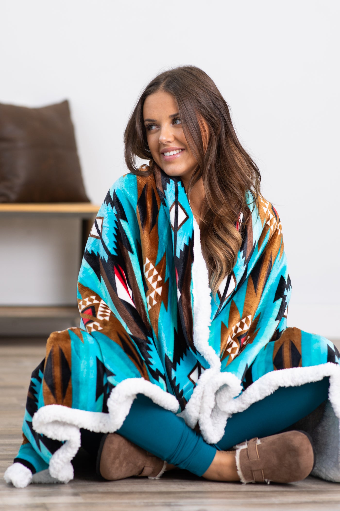 Turquoise and Brown Aztec Sherpa Back Blanket