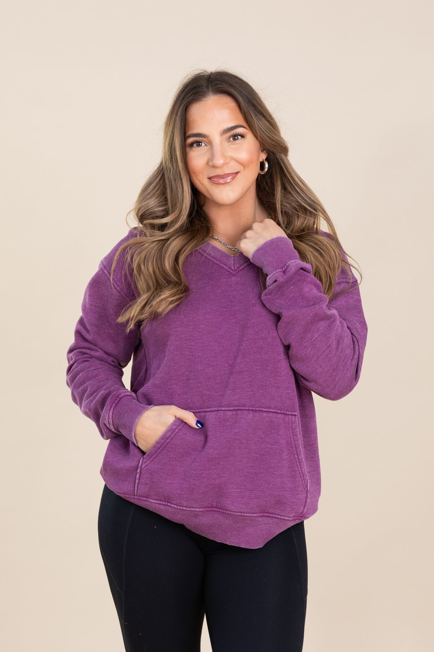 The purple is gorgeous. The material is so extremely soft and stretchy. I want to order 3 more colors! So comfy and fit is loose and comfy.