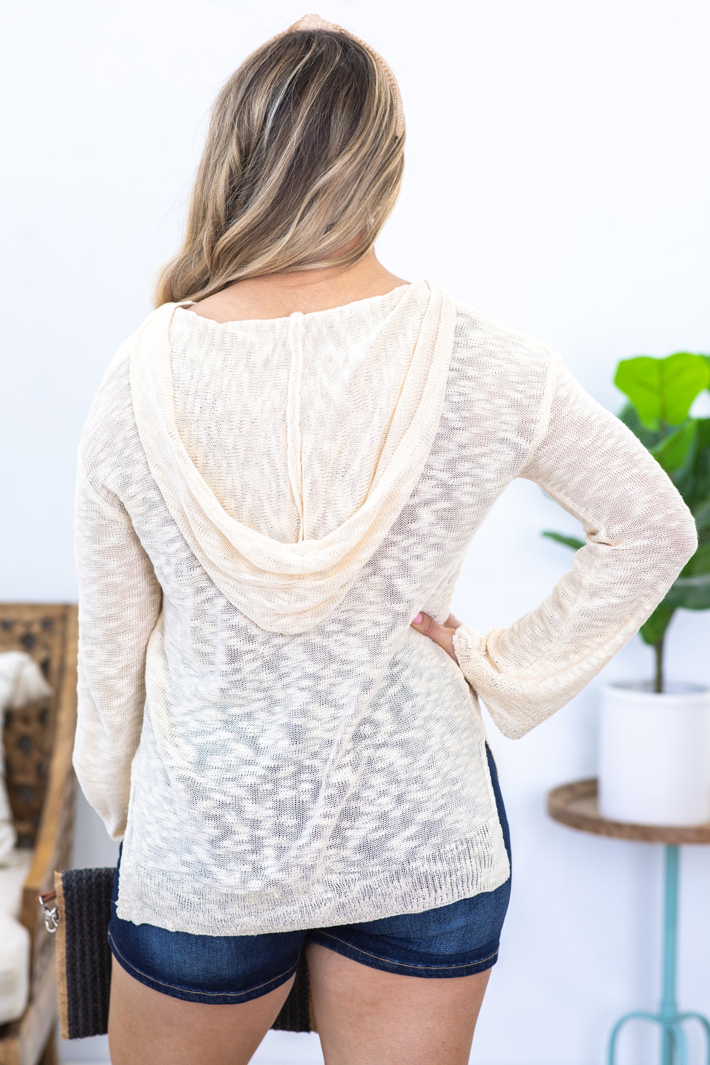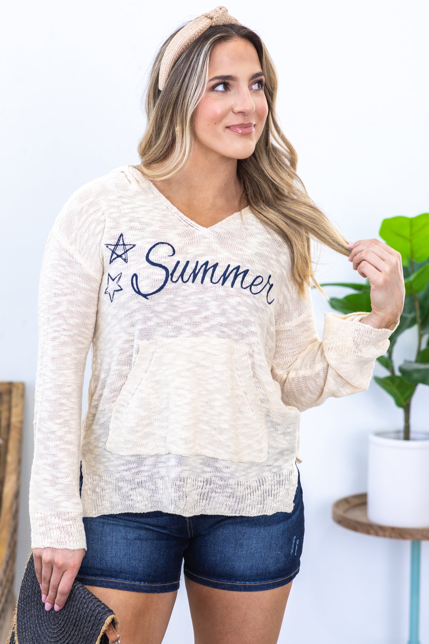 Beige Summer Embroidery Lightweight Hooded Top