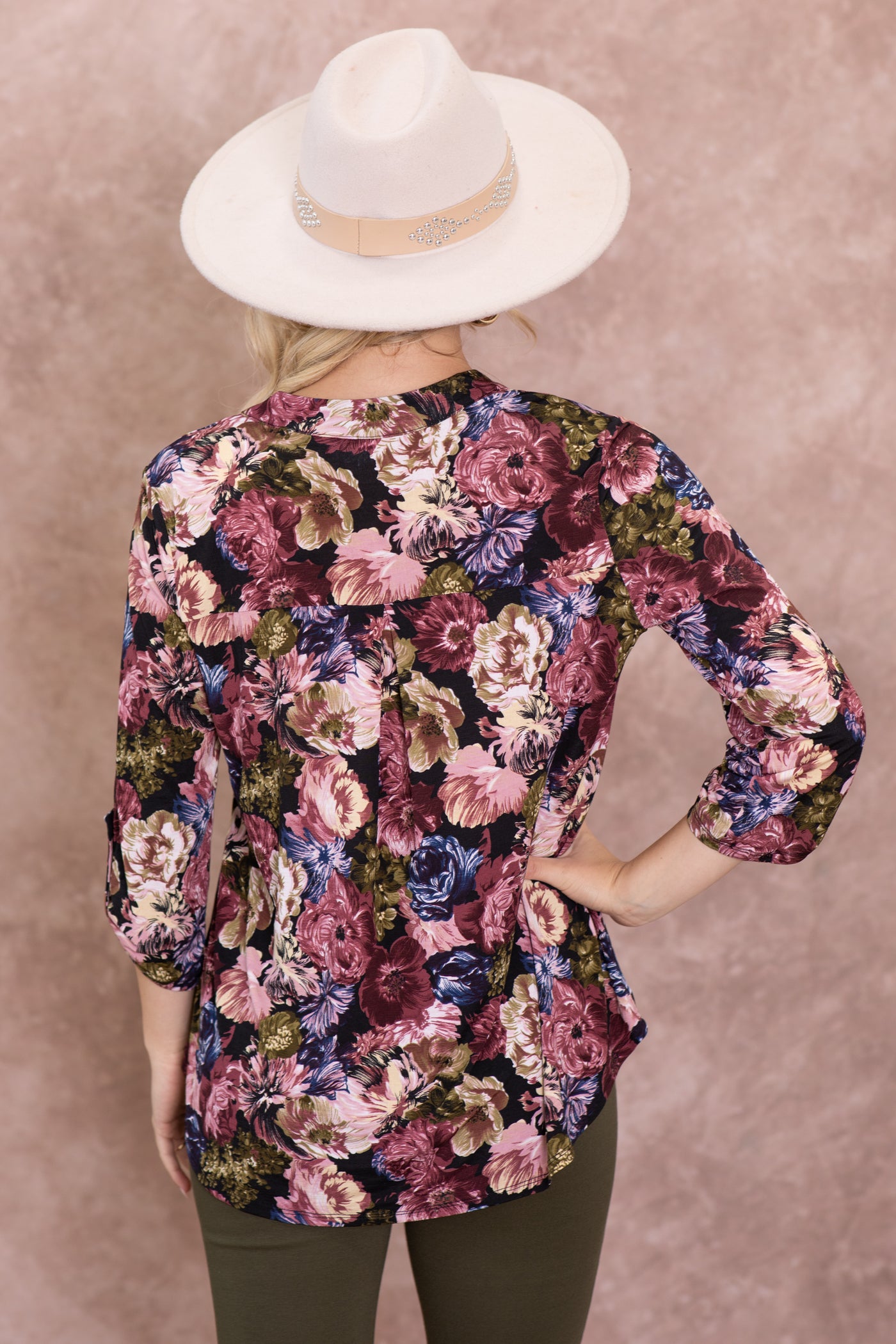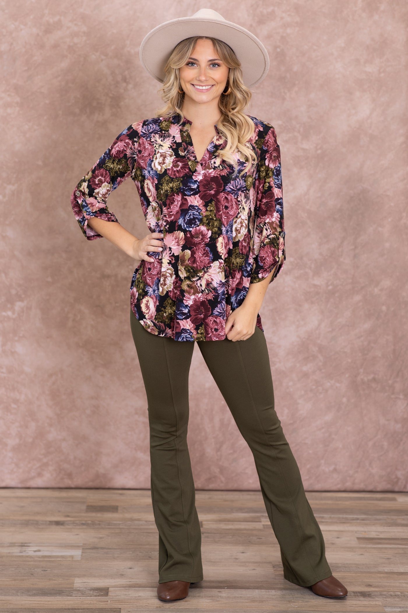 Black And Olive Floral Wrinkle Free Lizzy Top