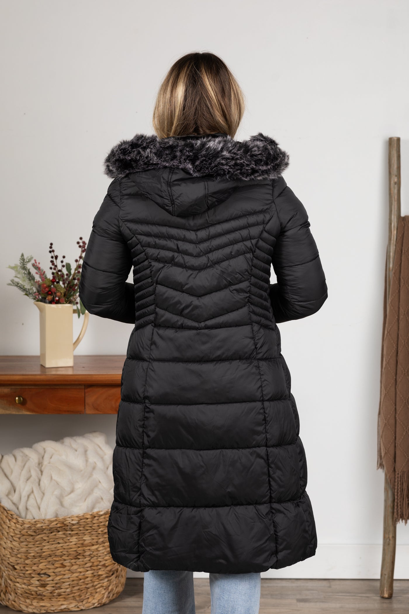Black Long Puffer Coat With Fur Hood