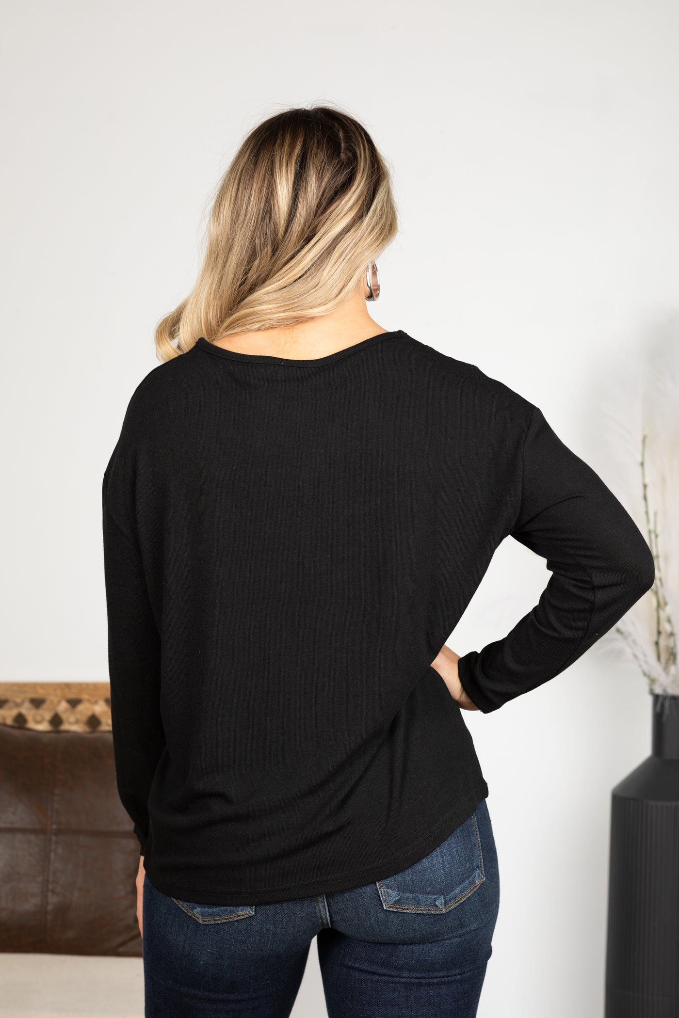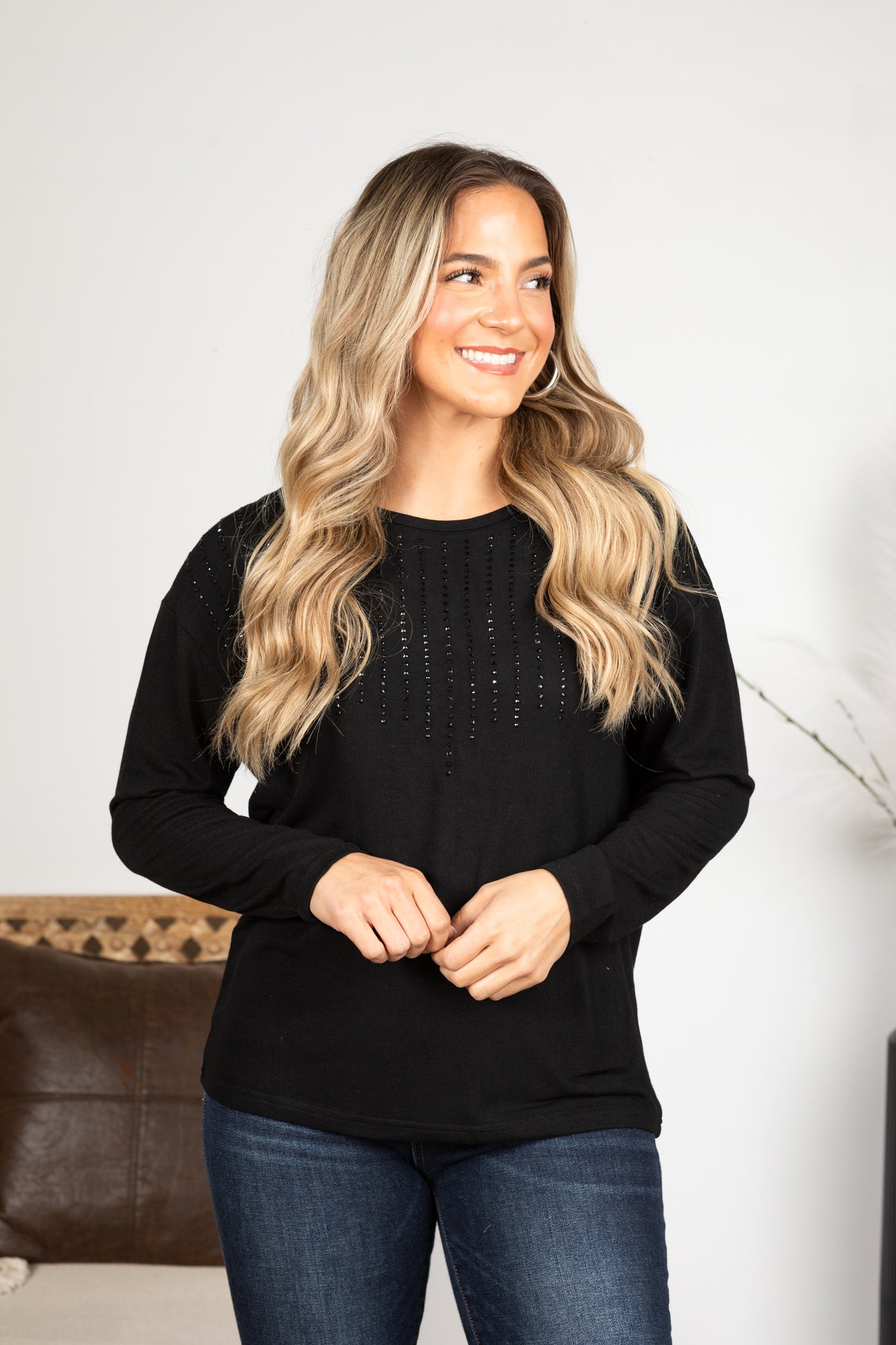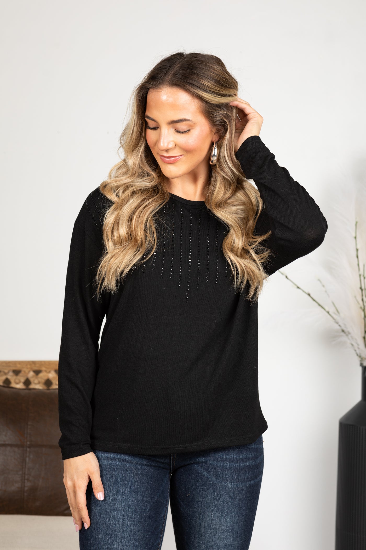 Black Long Sleeve Knit Top With Stones
