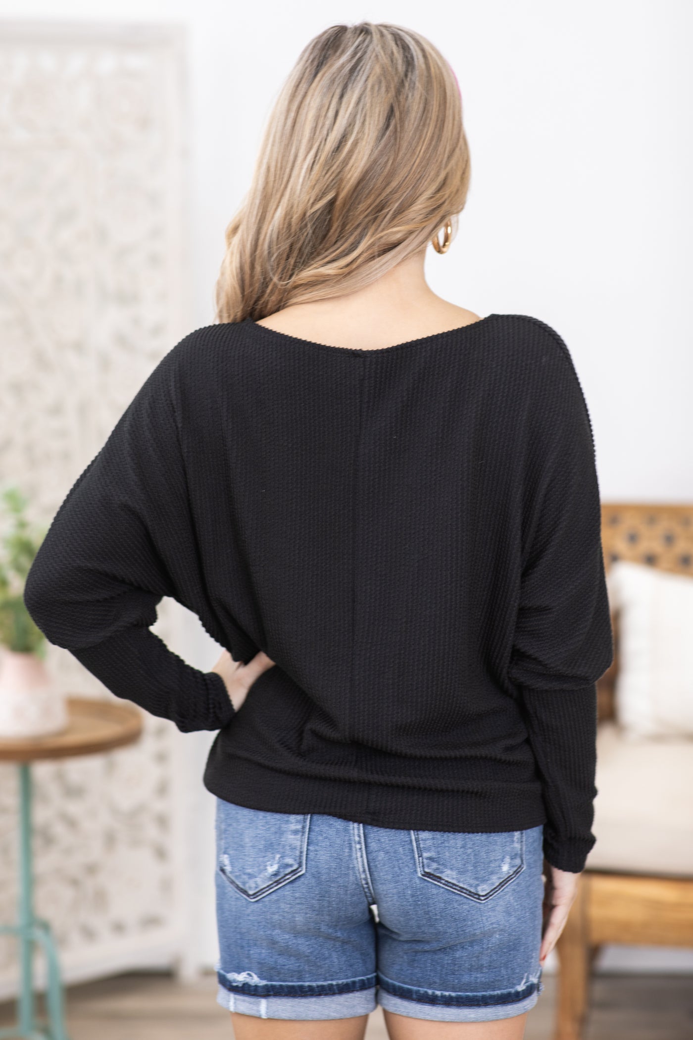 Black Ribbed Dolman Sleeve Knit Top