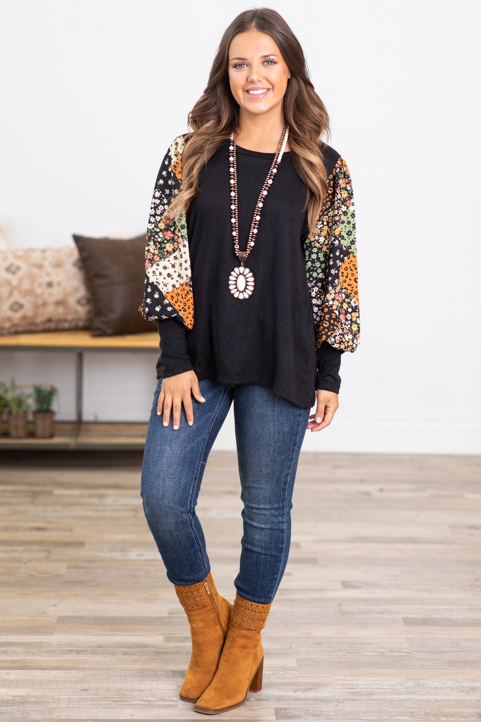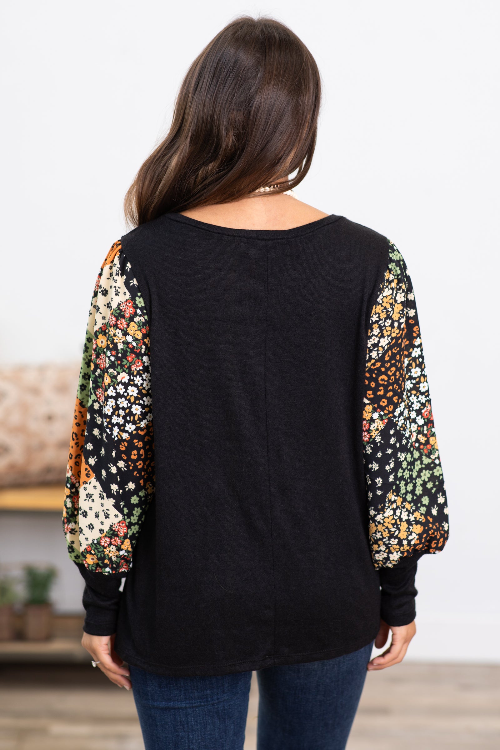 Black Top With Floral Patchwork Print Sleeves