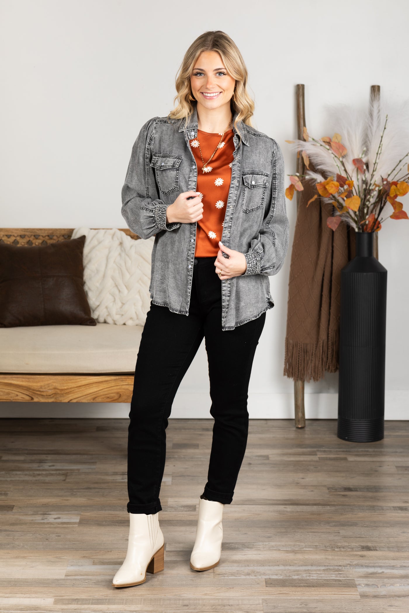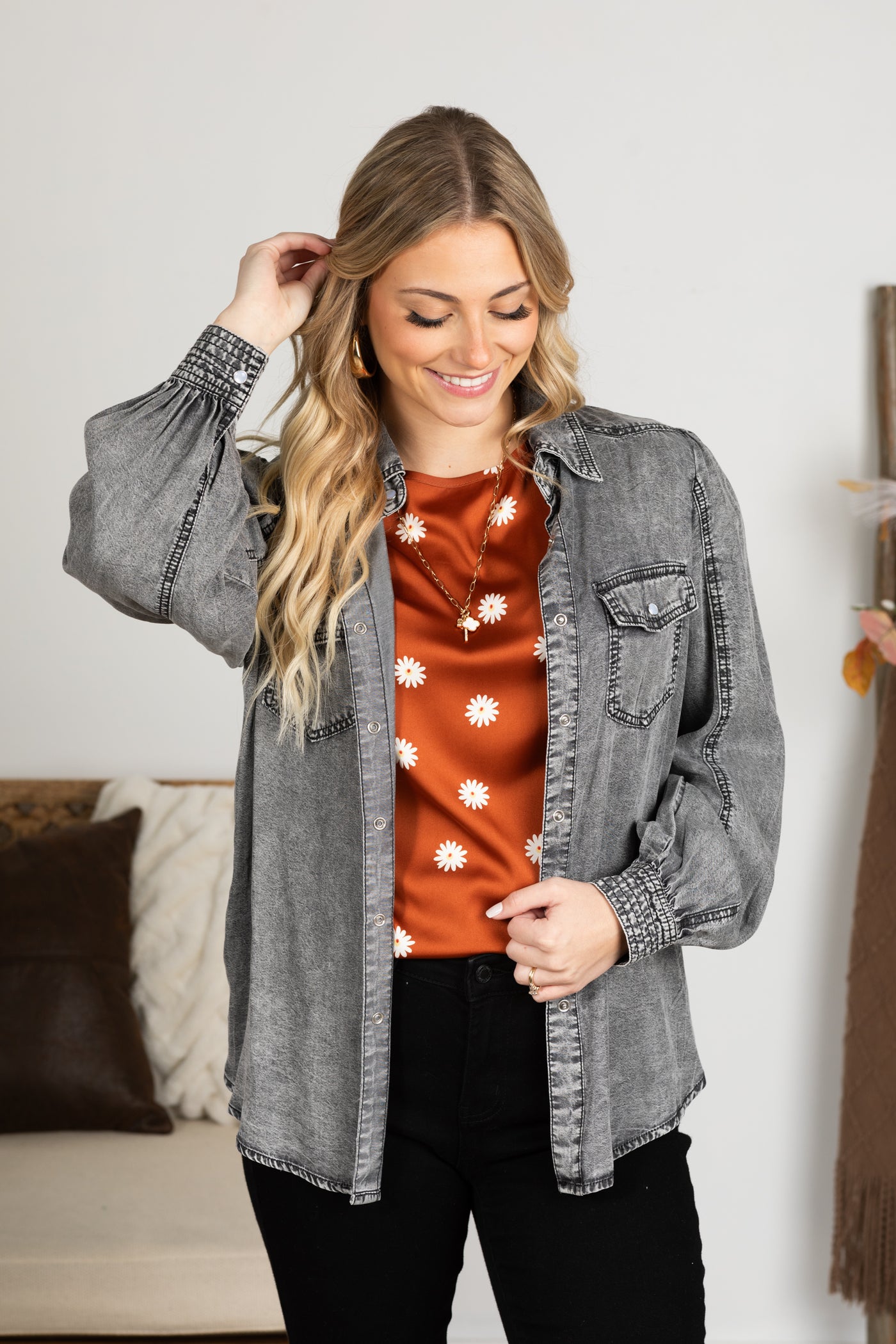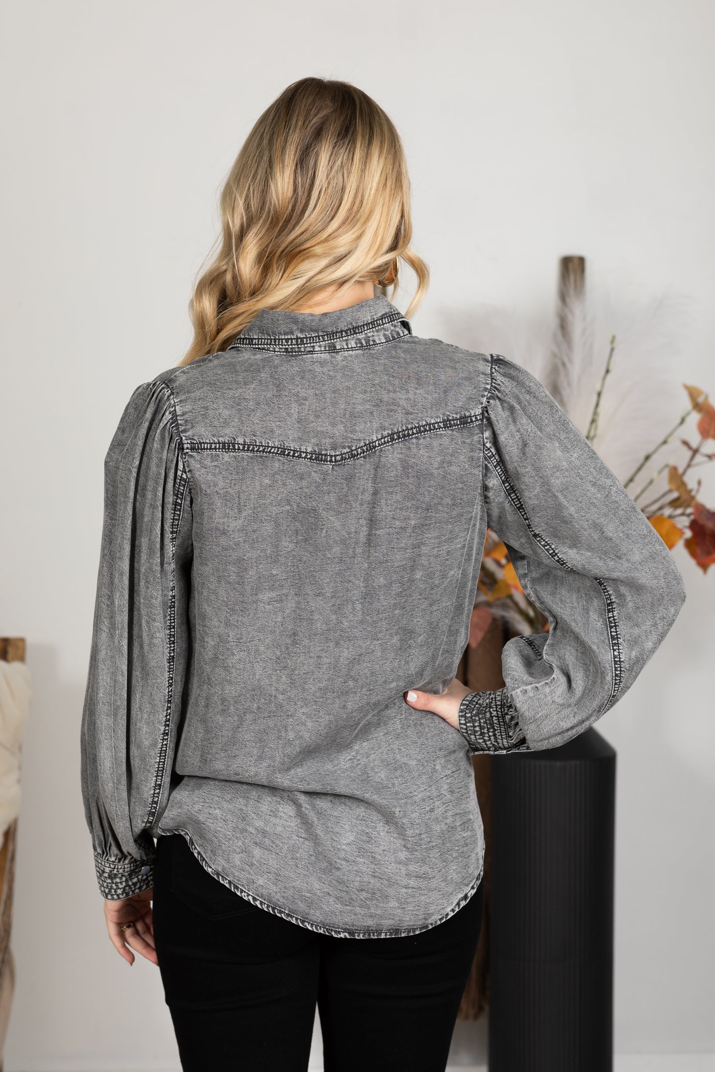 Black Washed Denim Button Up Woven Top