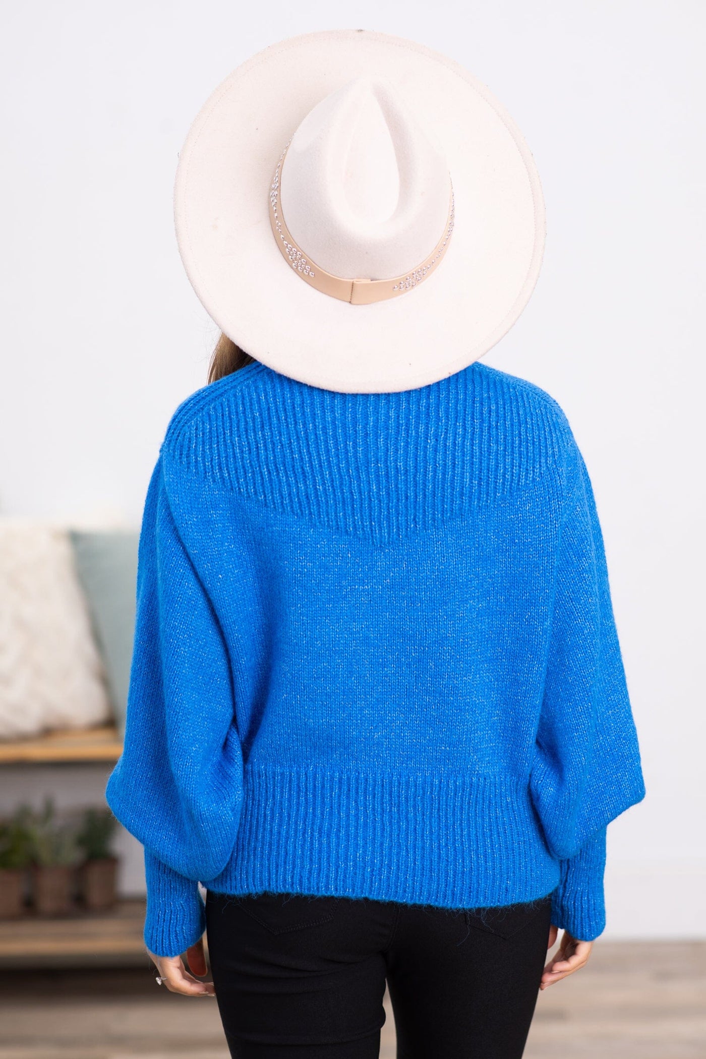 Blue Balloon Sleeve Mock Neck Sweater