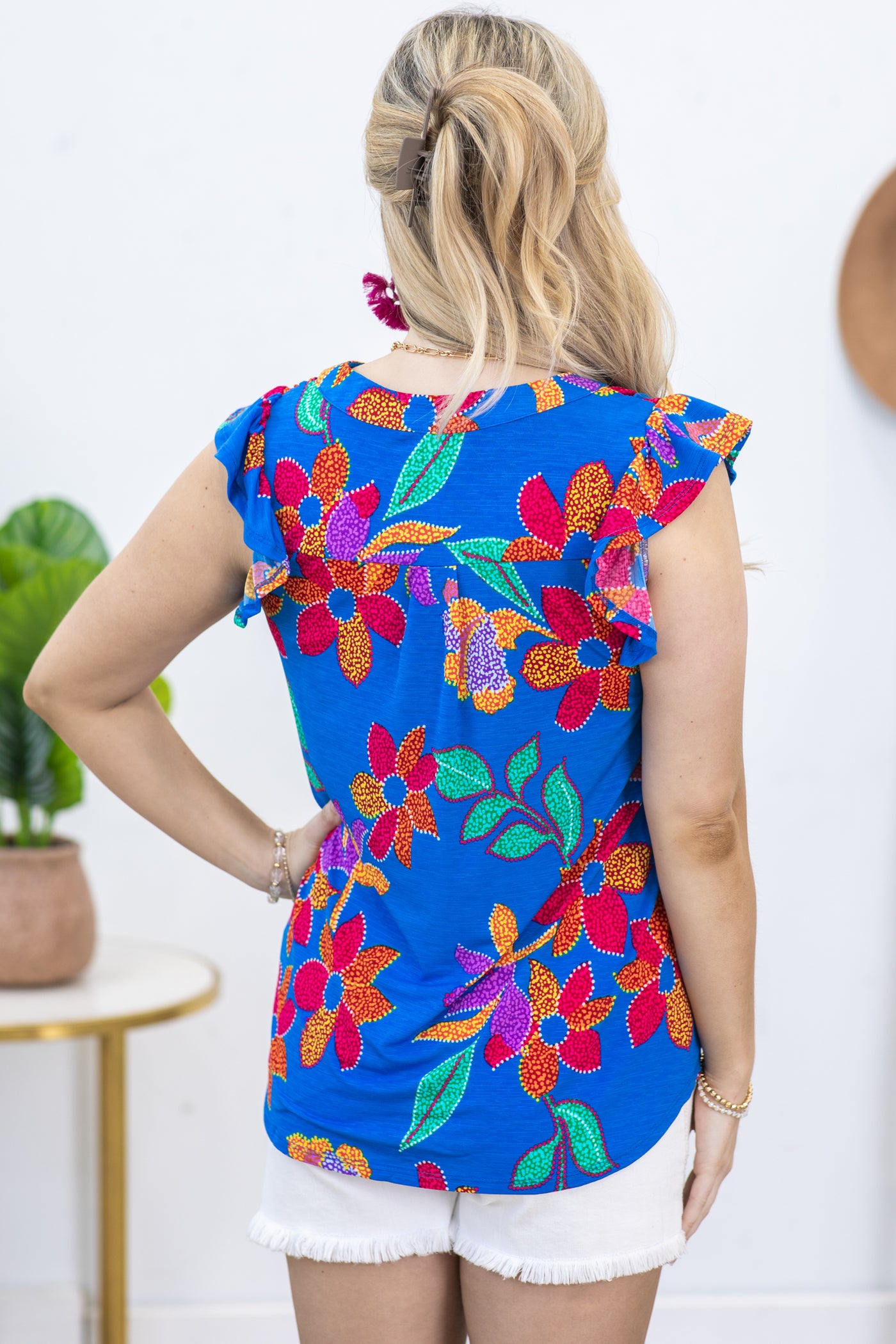 Blue Floral Ruffle Sleeve Wrinkle Free Top