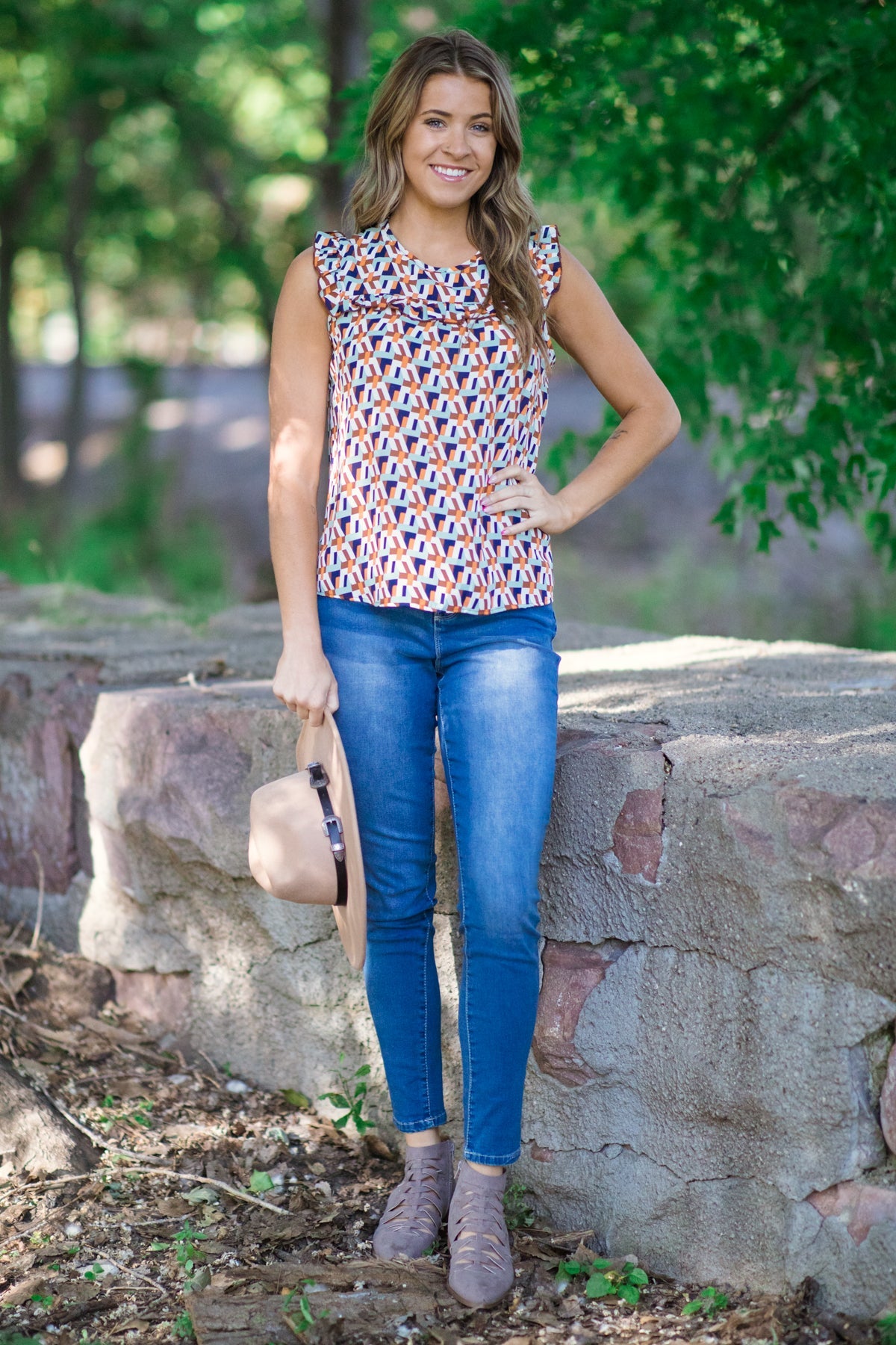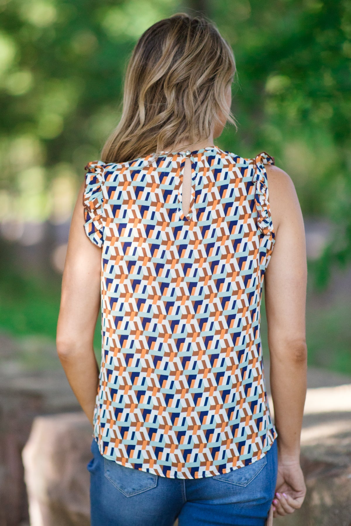 Brown Multicolor Geometric Ruffle Trim Top
