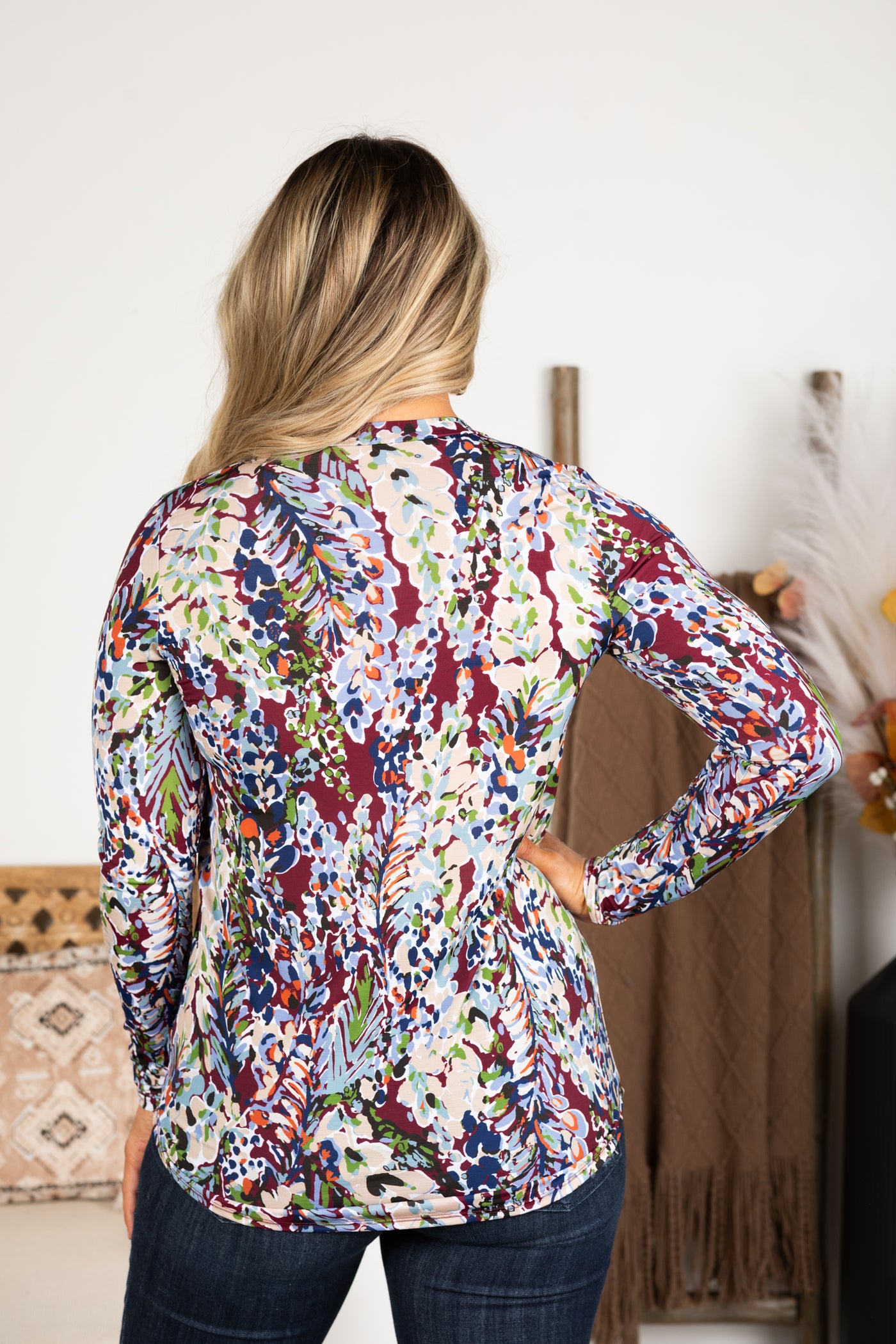 Burgundy Abstract Long Sleeve Knit Top