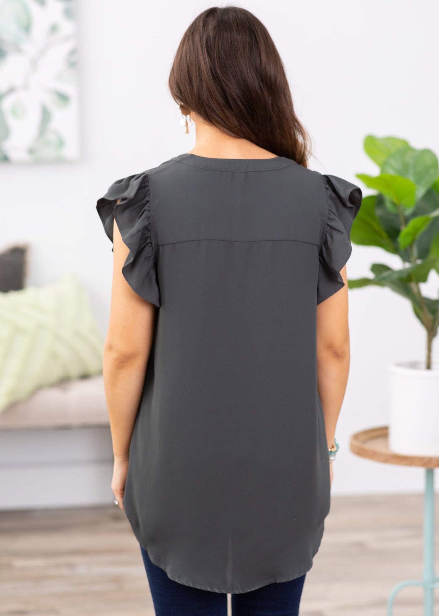Charcoal Flutter Sleeve Top With Notch Neck