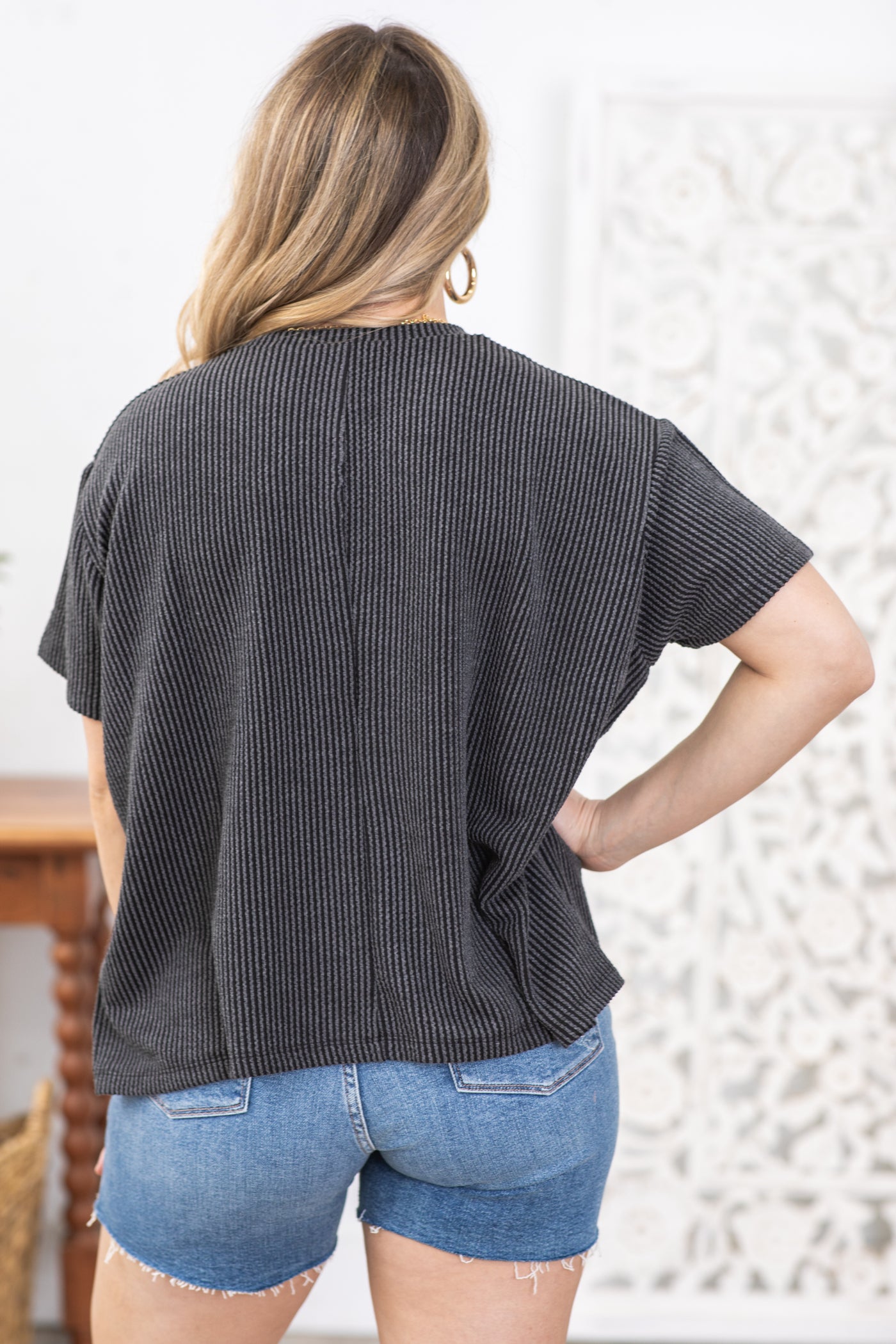 Charcoal Texture Ribbed Short Sleeve Knit Top