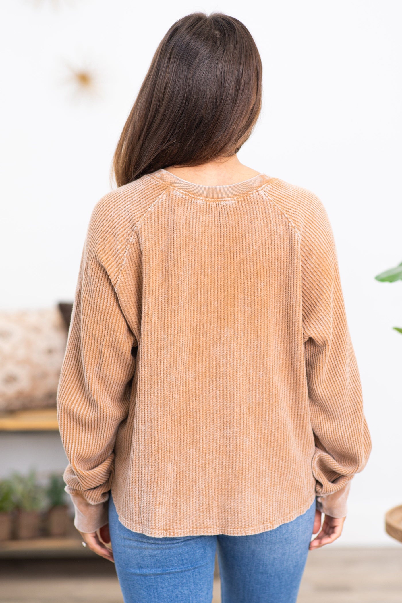 Super cute waffle top. I am tall and the sleeves were perfect. A bit more cropped on me but it works great with a high rise jean.