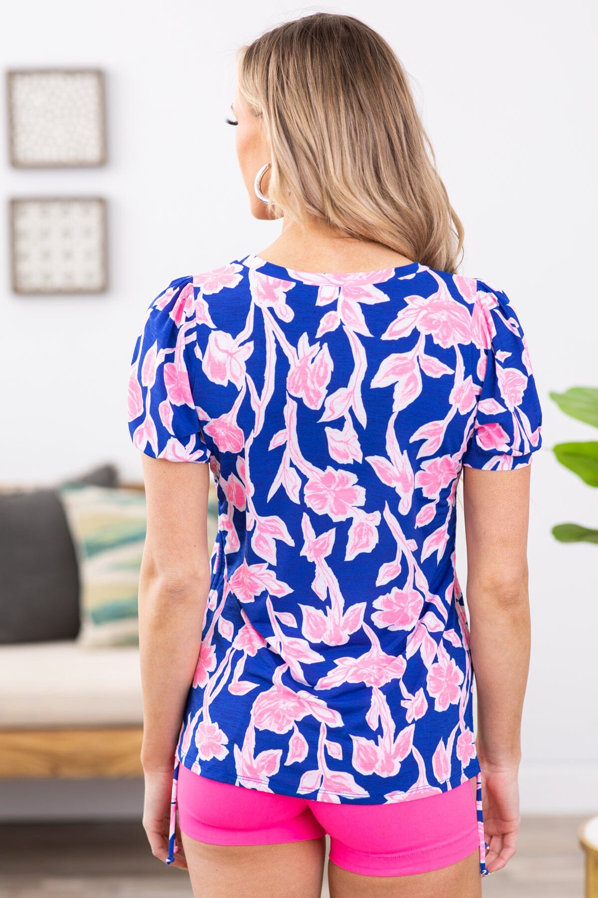 Cobalt and Neon Pink Floral Print Top