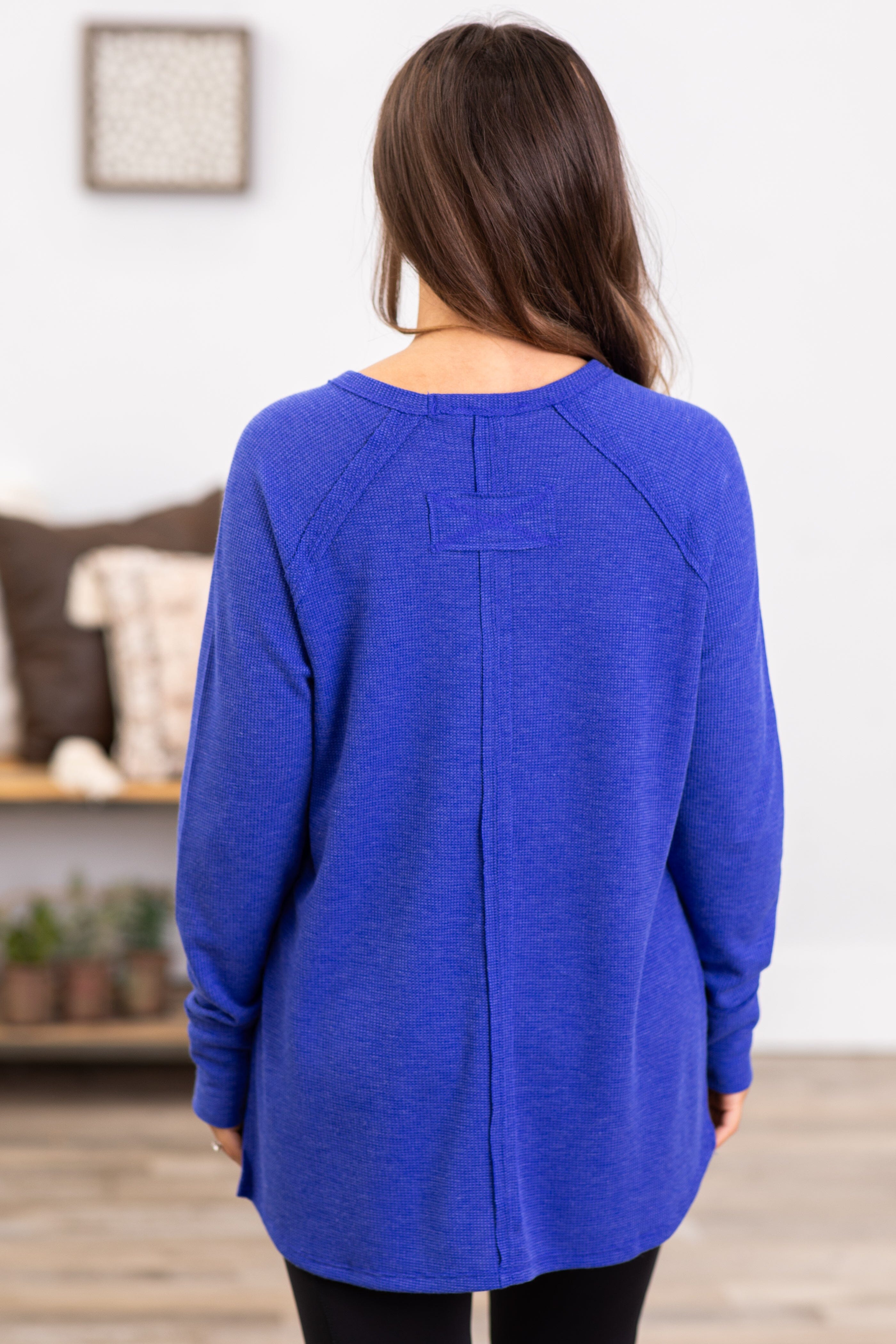 Vibrant blue. Soft. Great quality and TTS fit. Looks great with leggings.