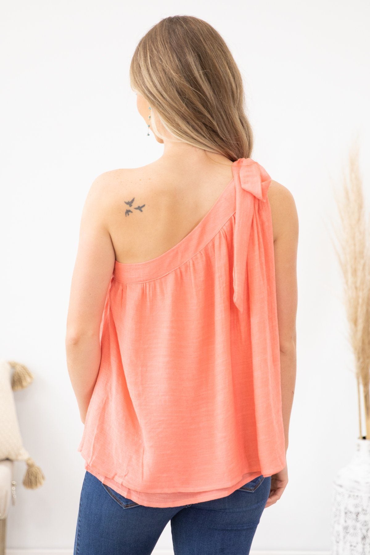 Coral Tied One Shoulder Banded Neckline Top