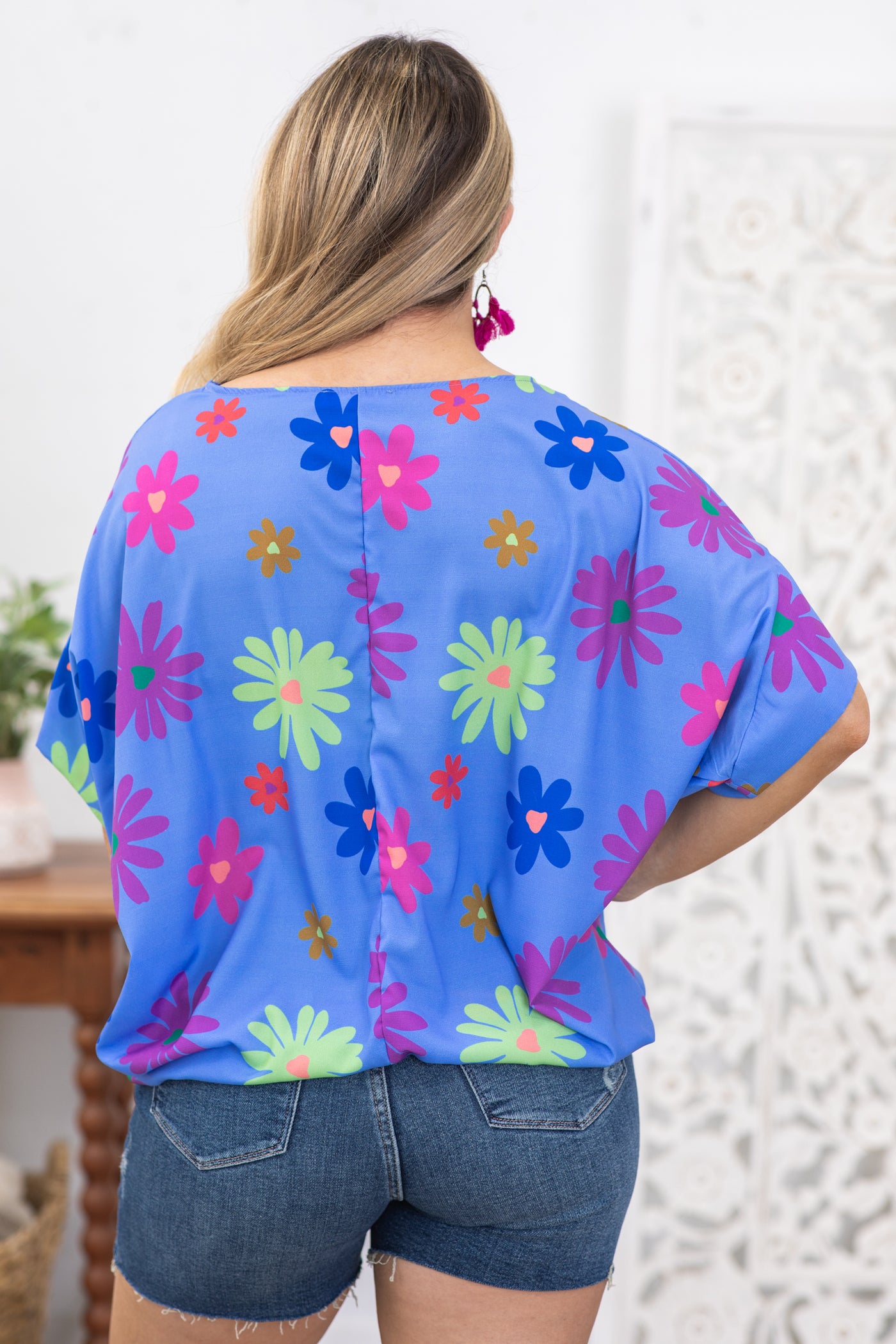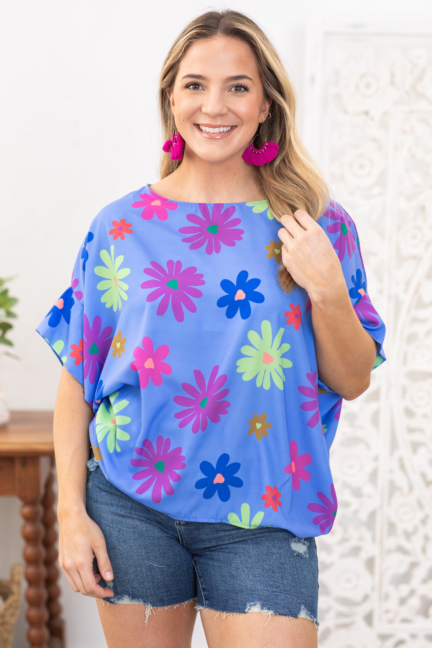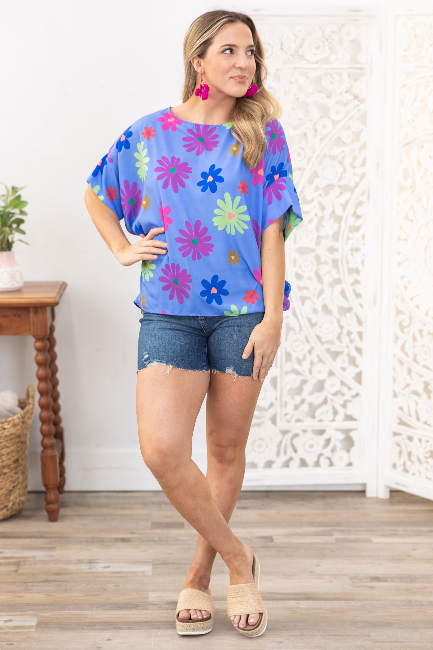 Cornflower Round Neck Floral Woven Top