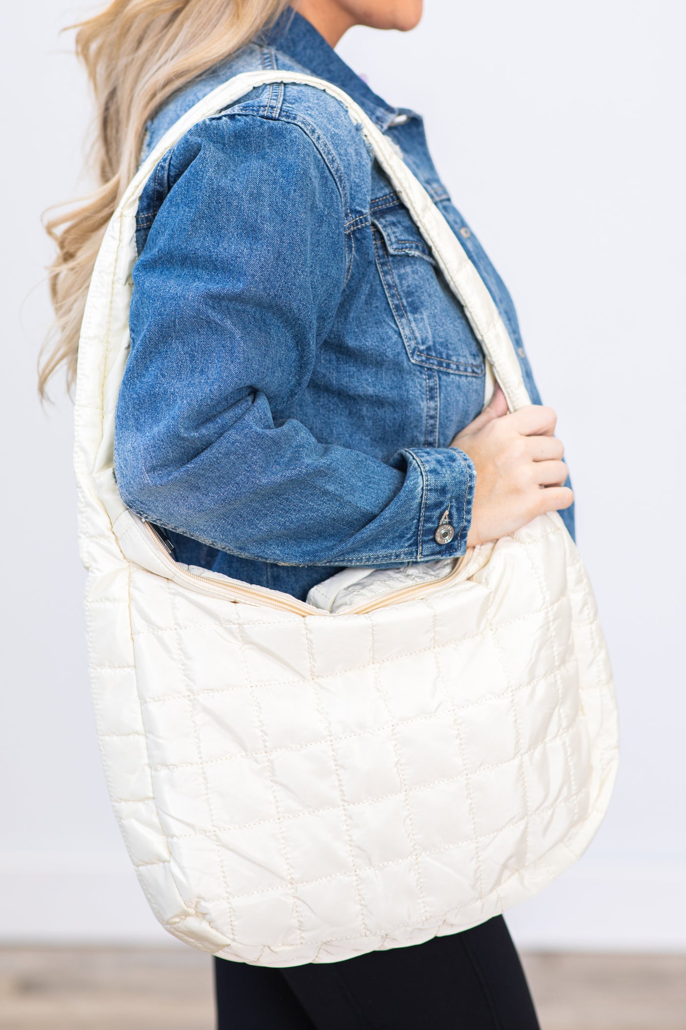 Cream Quilted Zipper Shoulder Bag
