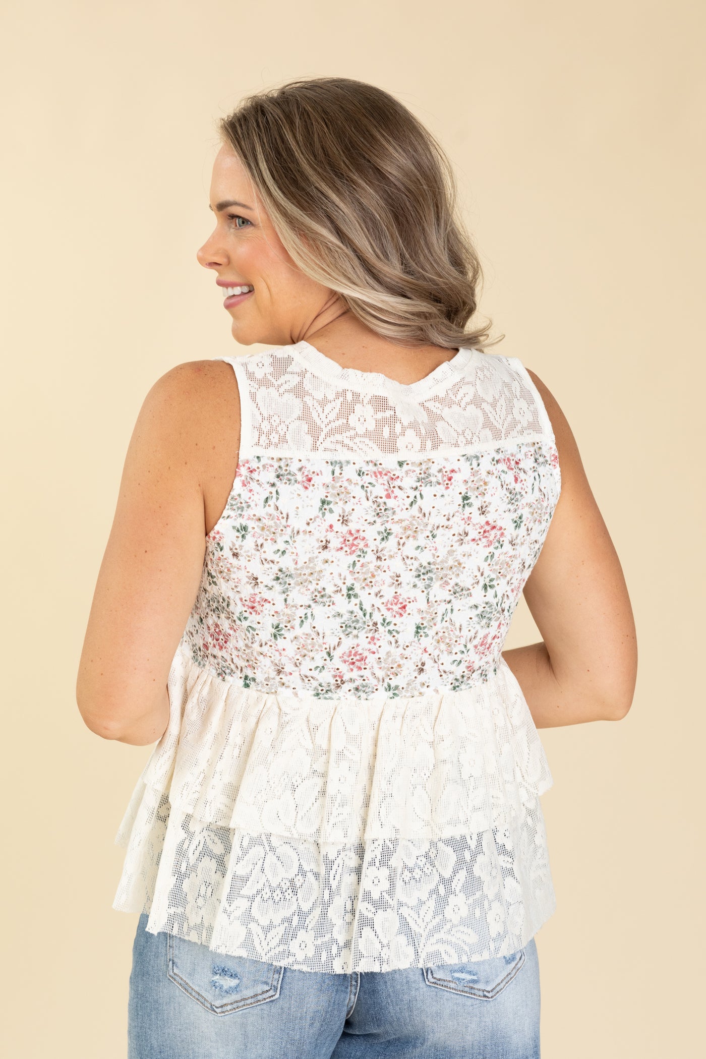 Cream Sleeveless Lace Floral Printed Woven Top