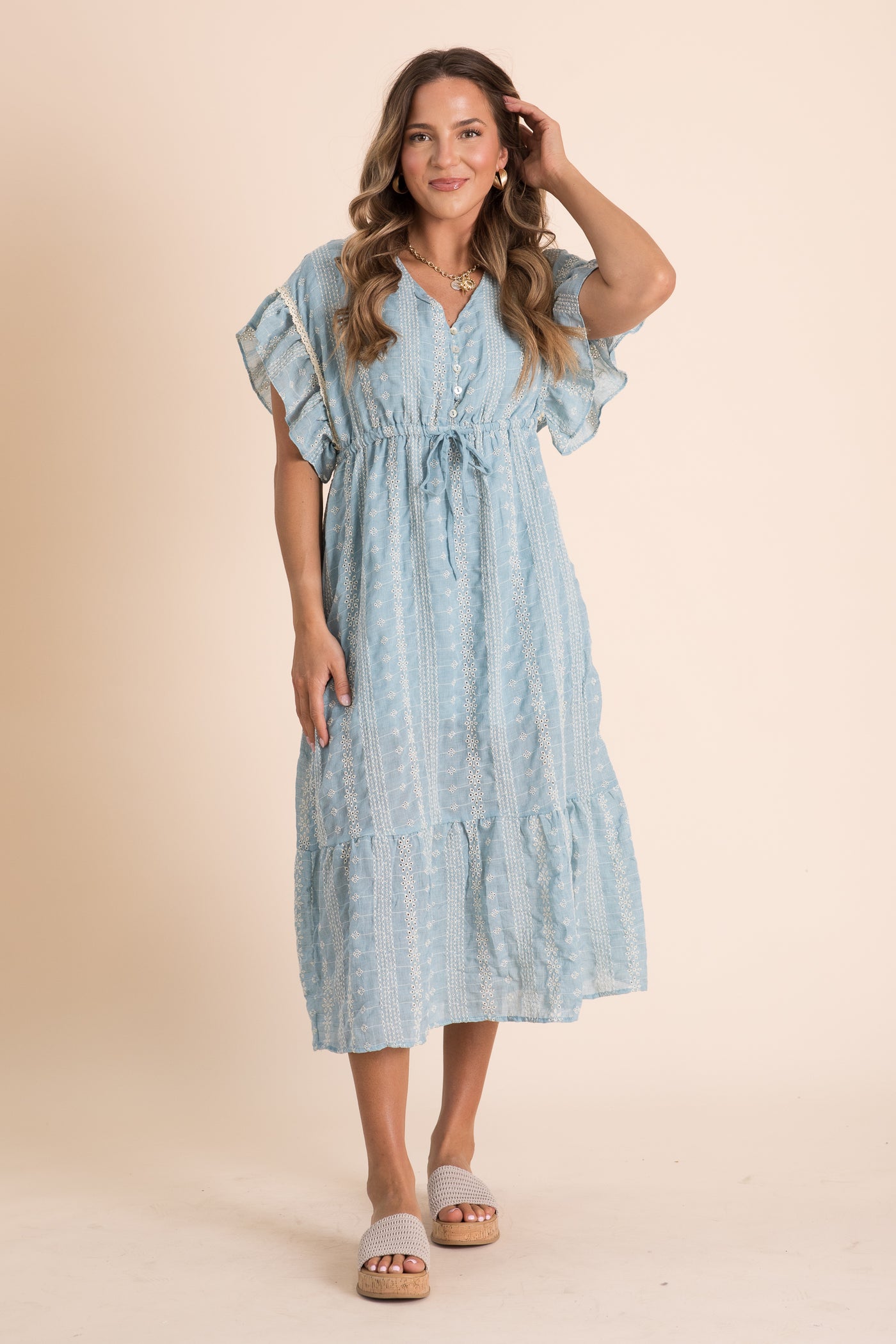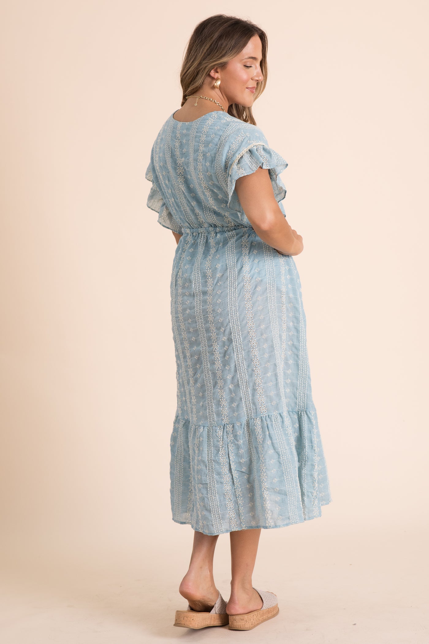 Dusty Blue Embroidered Boho Ruffled Midi Dress