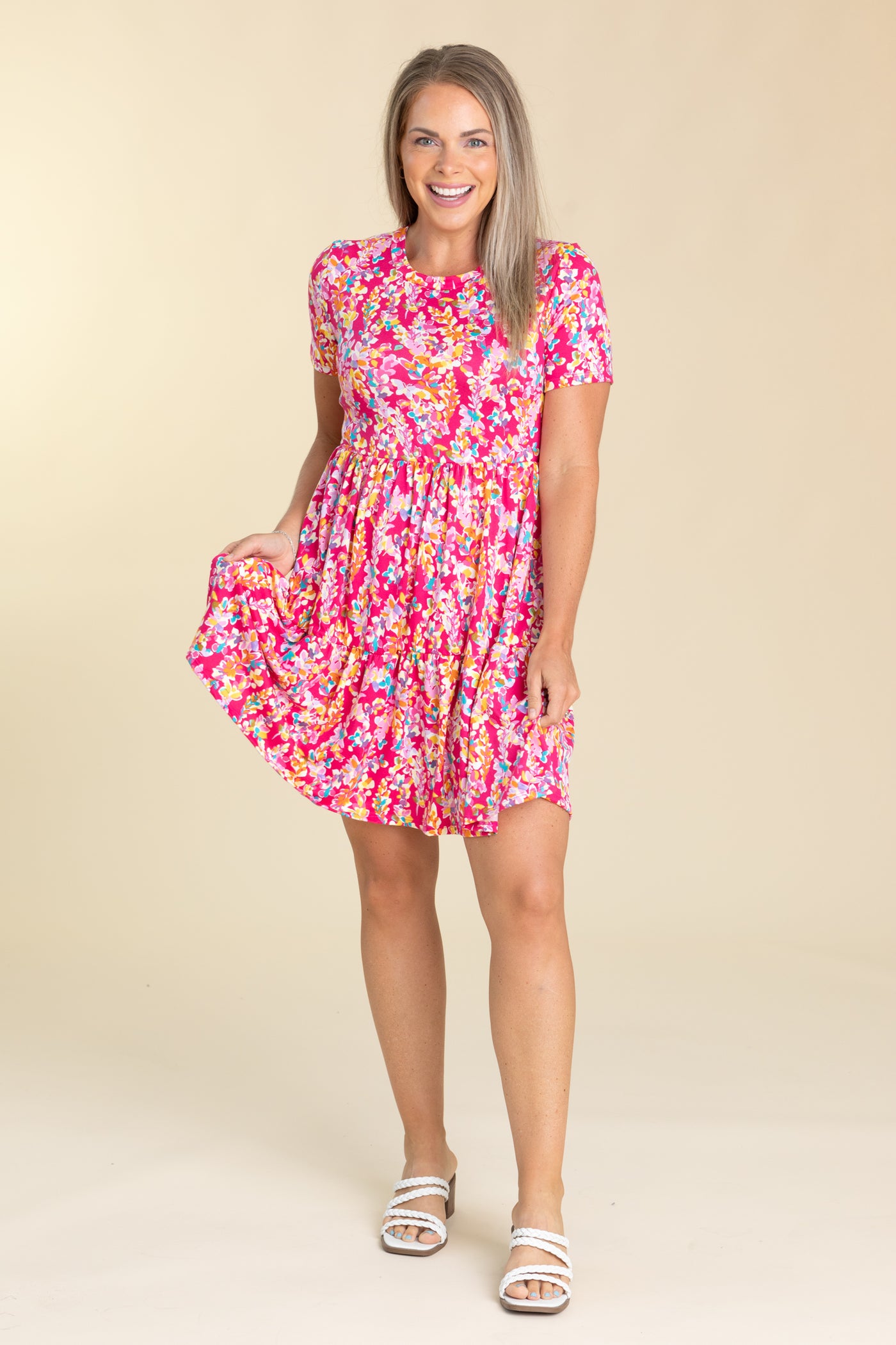 Love love loved this dress when it came in. I got the pink/black and colors were vibrant, it is super soft, and pockets! Thought it would be a great casual dress and for vacation. Size medium fit great, except for the length, it was too short! Not really visible in the photo is the seam along the skirt bottom. It hit in a really weird place on me, I'm 5'7". (normally an 8/10) I gave it to my friend though, who is 5'2", and it worked great for her.