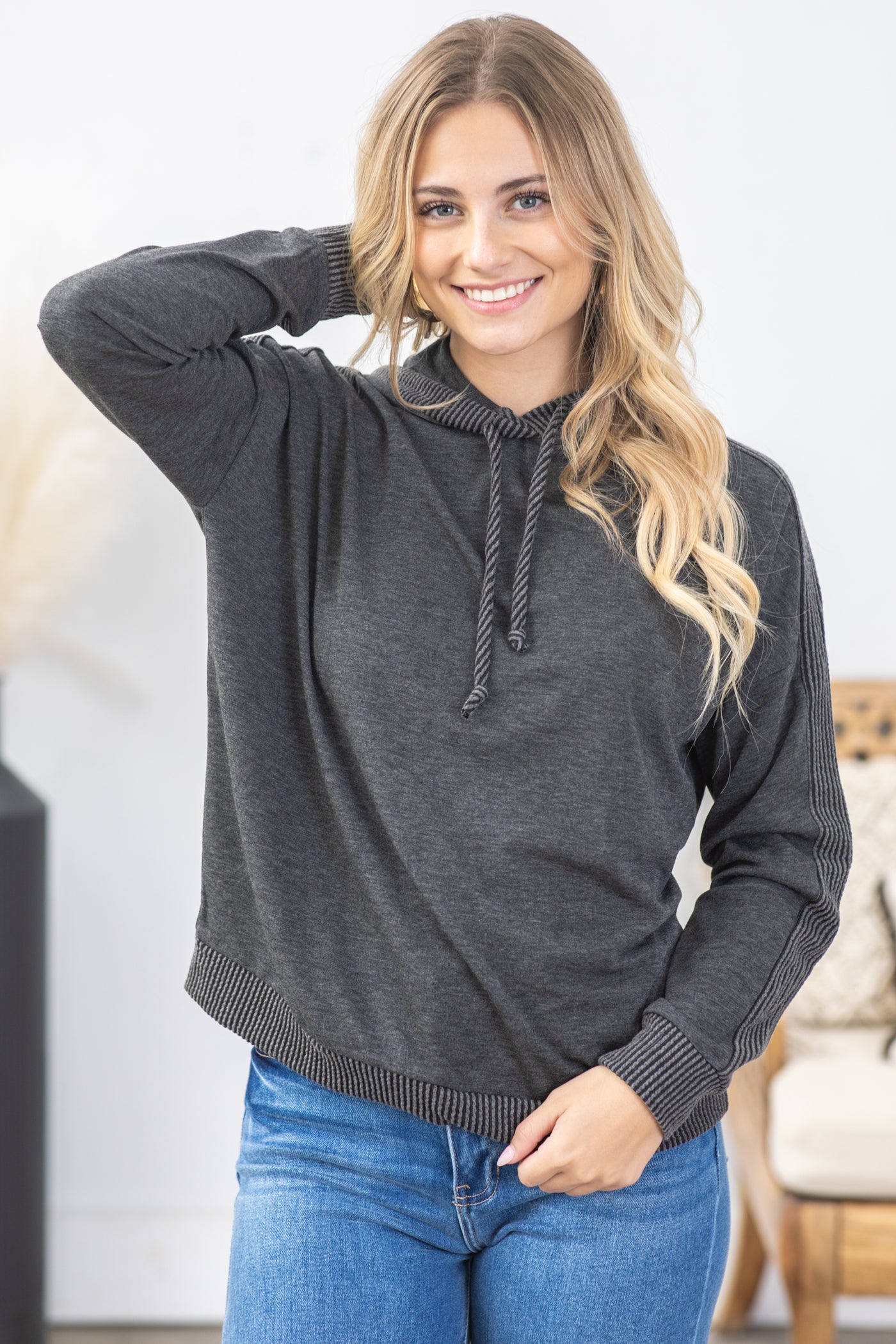 French Terry Hooded Top With Ribbed Detail