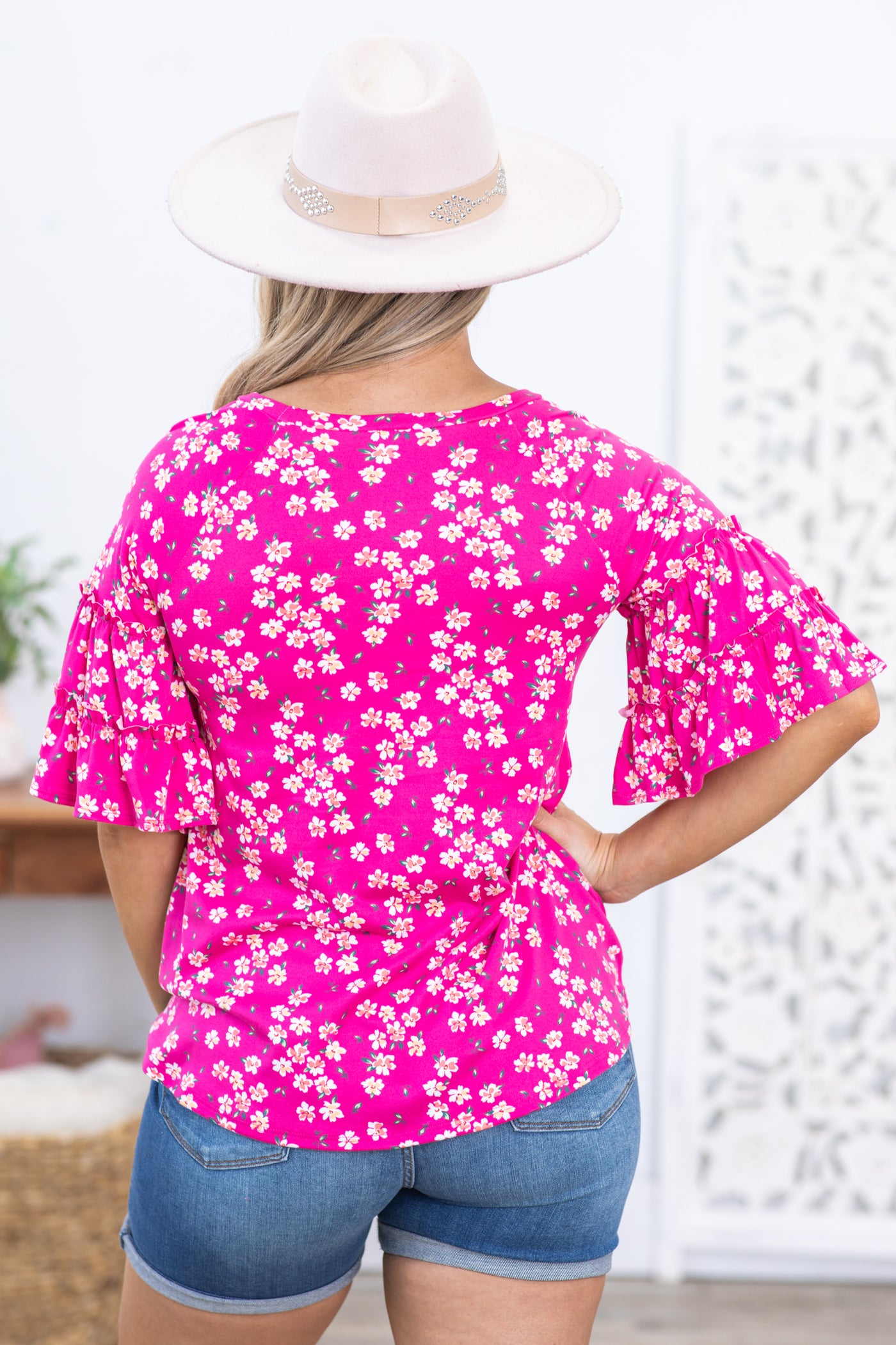 Fuchsia Floral Tiered Bell Sleeve Knit Top