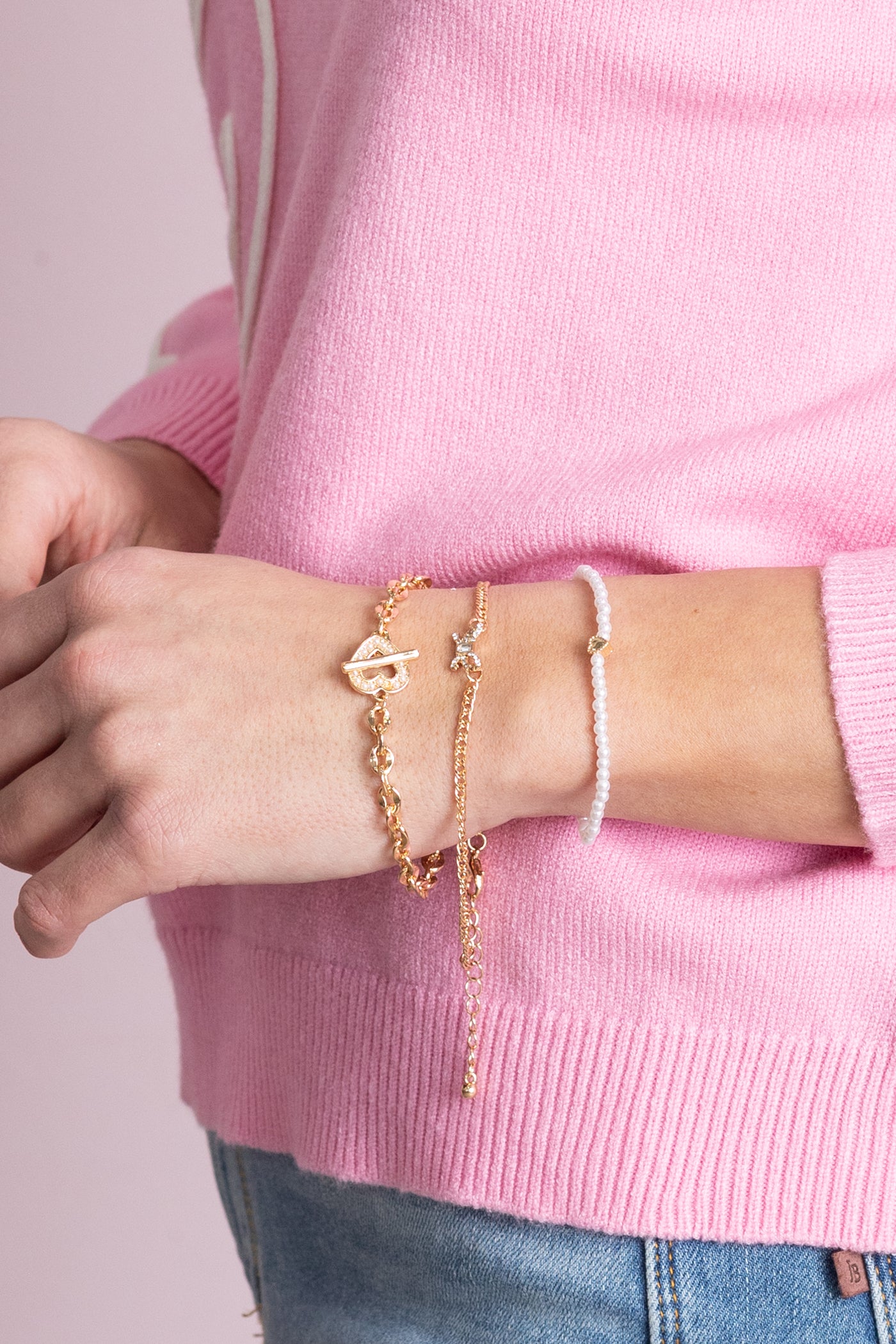 • Other Details: Set of 3 Bracelets: white pearl stretchy bracelet with gold heart, gold heart pendant with white pearls toggle closure bracelet and gold lobster claw closure bracelet with clear rhinestone bow