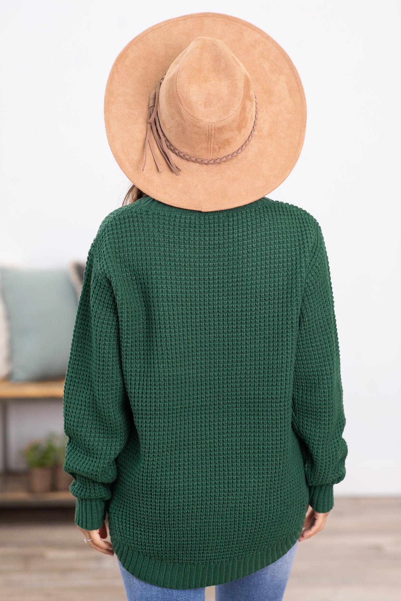 Green Waffle Knit Round Hem Sweater