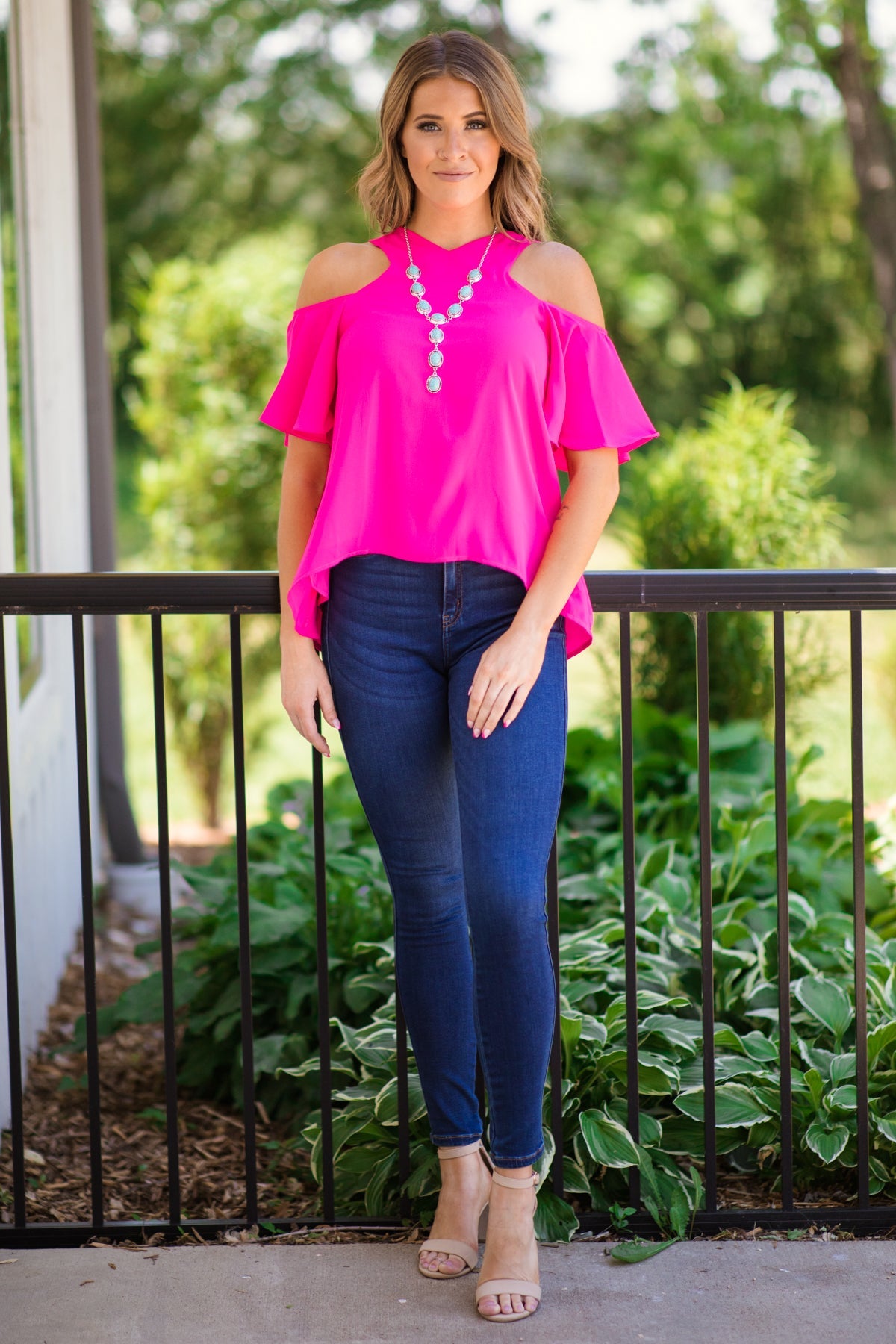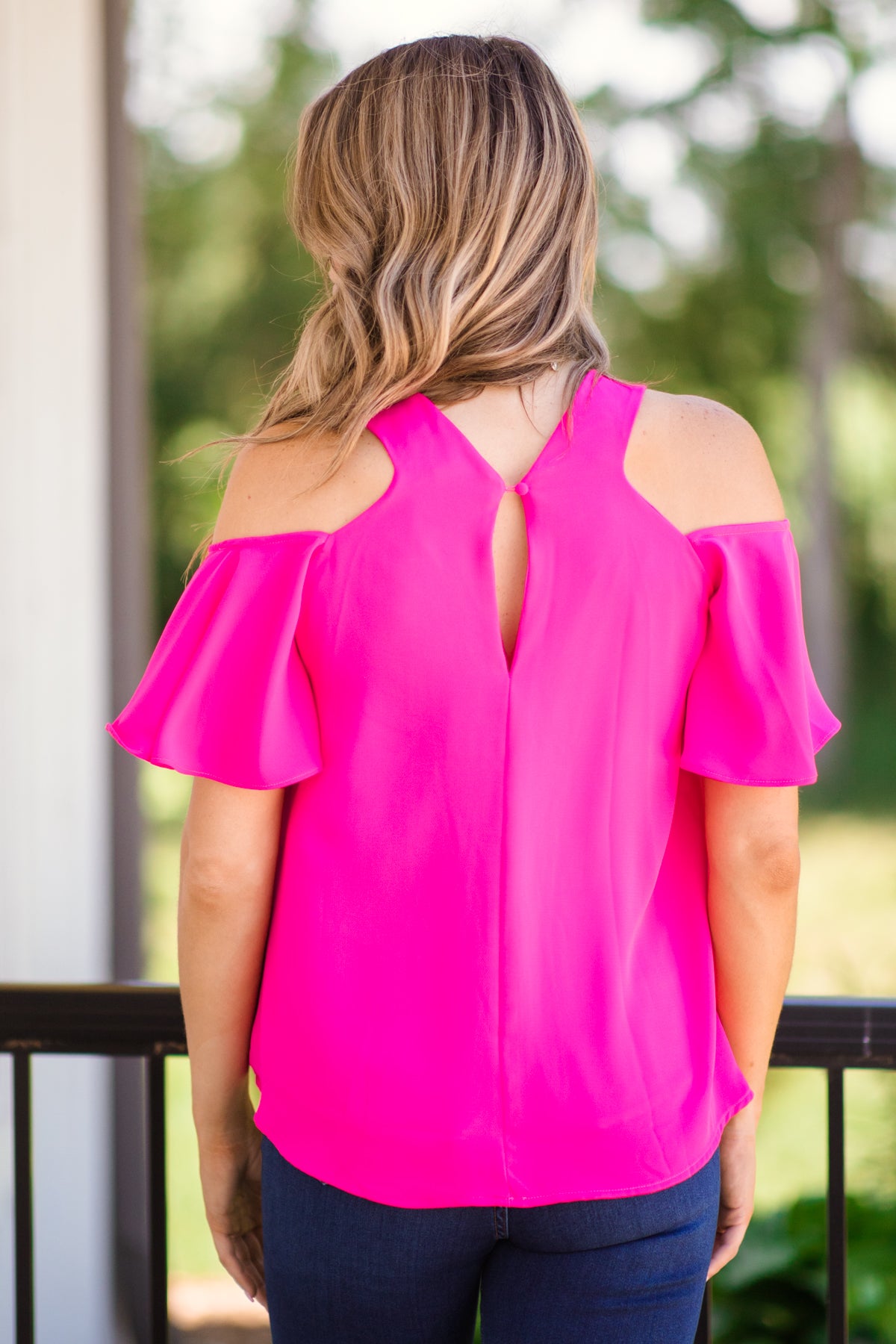 Hot Pink Flutter Sleeve Cold Shoulder Top