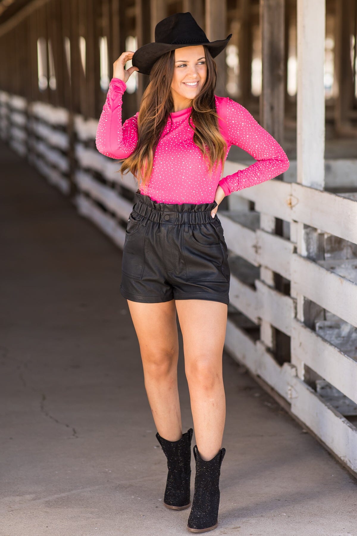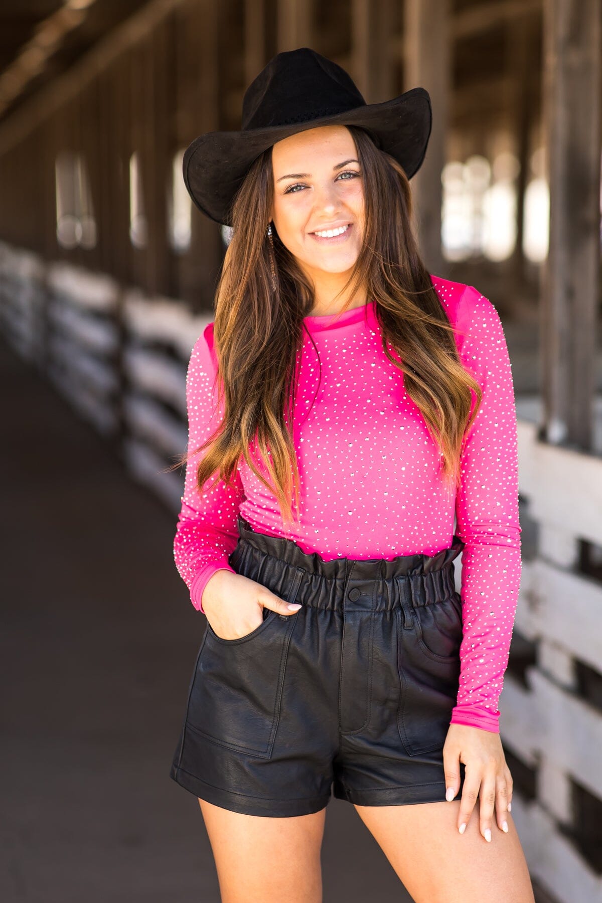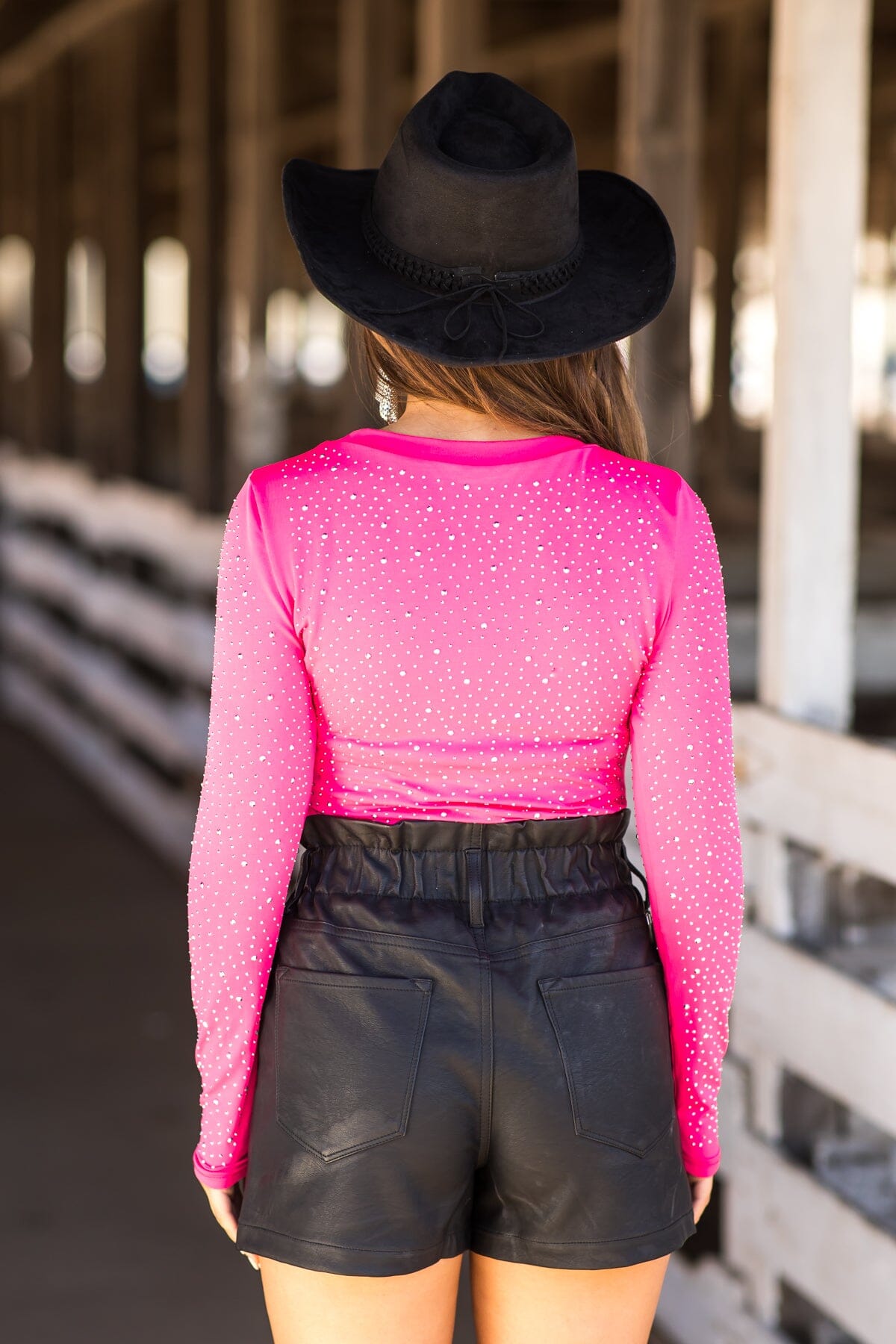 Hot Pink Long Sleeve Bodysuit With Rhinestones