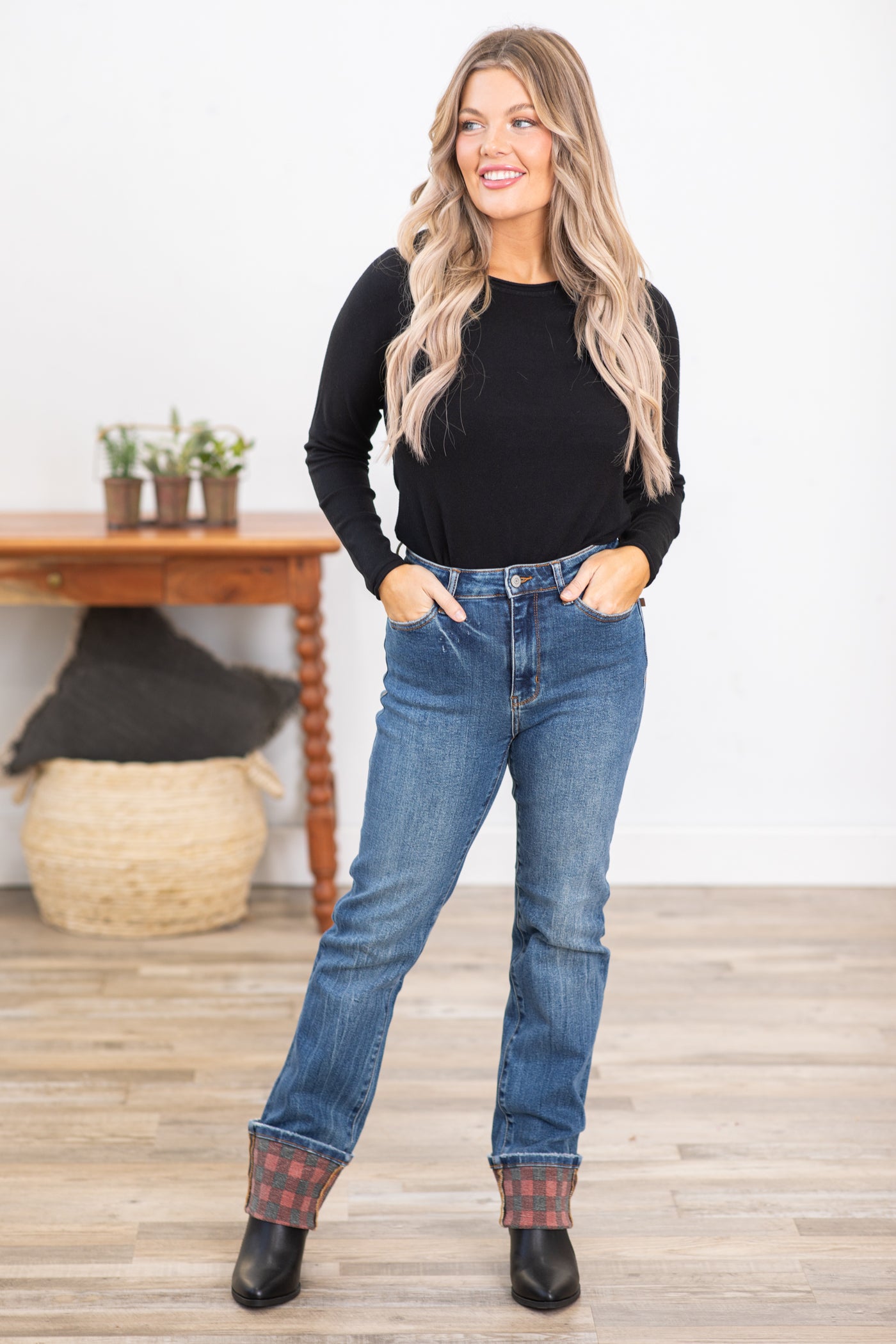 My long legs love the length on these jeans. I decreased the size of the cuffs a little bit and theyโre perfect. I have a couple red plaid shirts already that look great with them. Judy Blue is my absolute go brand of jeans!!
