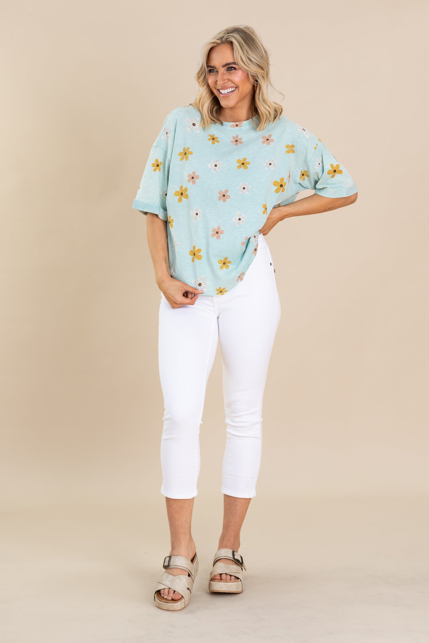 Light Teal Daisy Printed Cotton Slub Knit Top