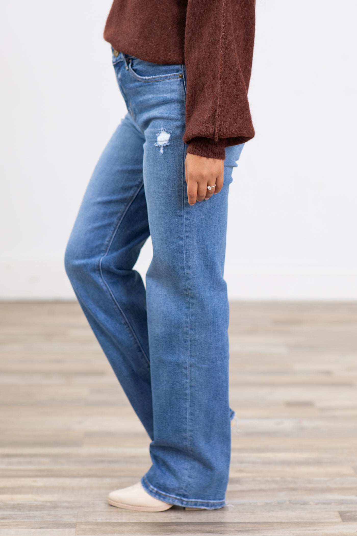 The description said straight leg but the pair I received is more like bell bottoms. They are not straight leg.