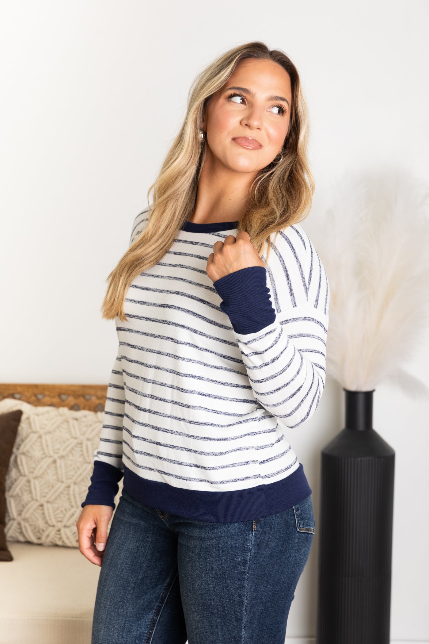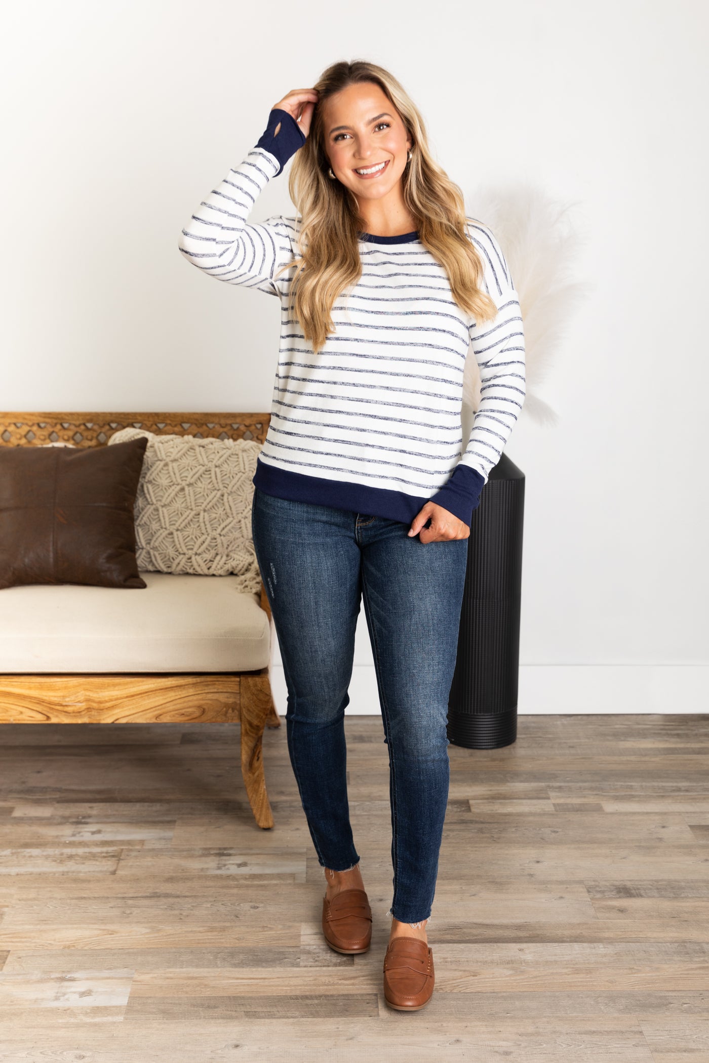 Navy and Ivory Stripe Thumbhole Cuff Knit Top