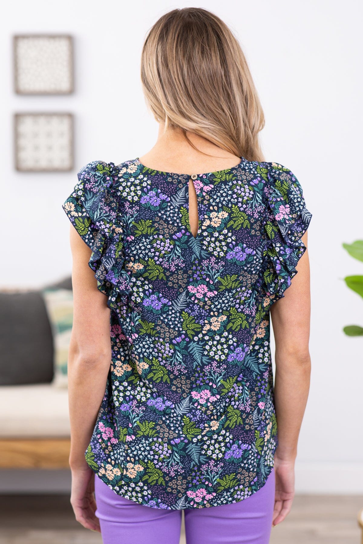 Navy and Purple Multicolor Floral V-Neck Top