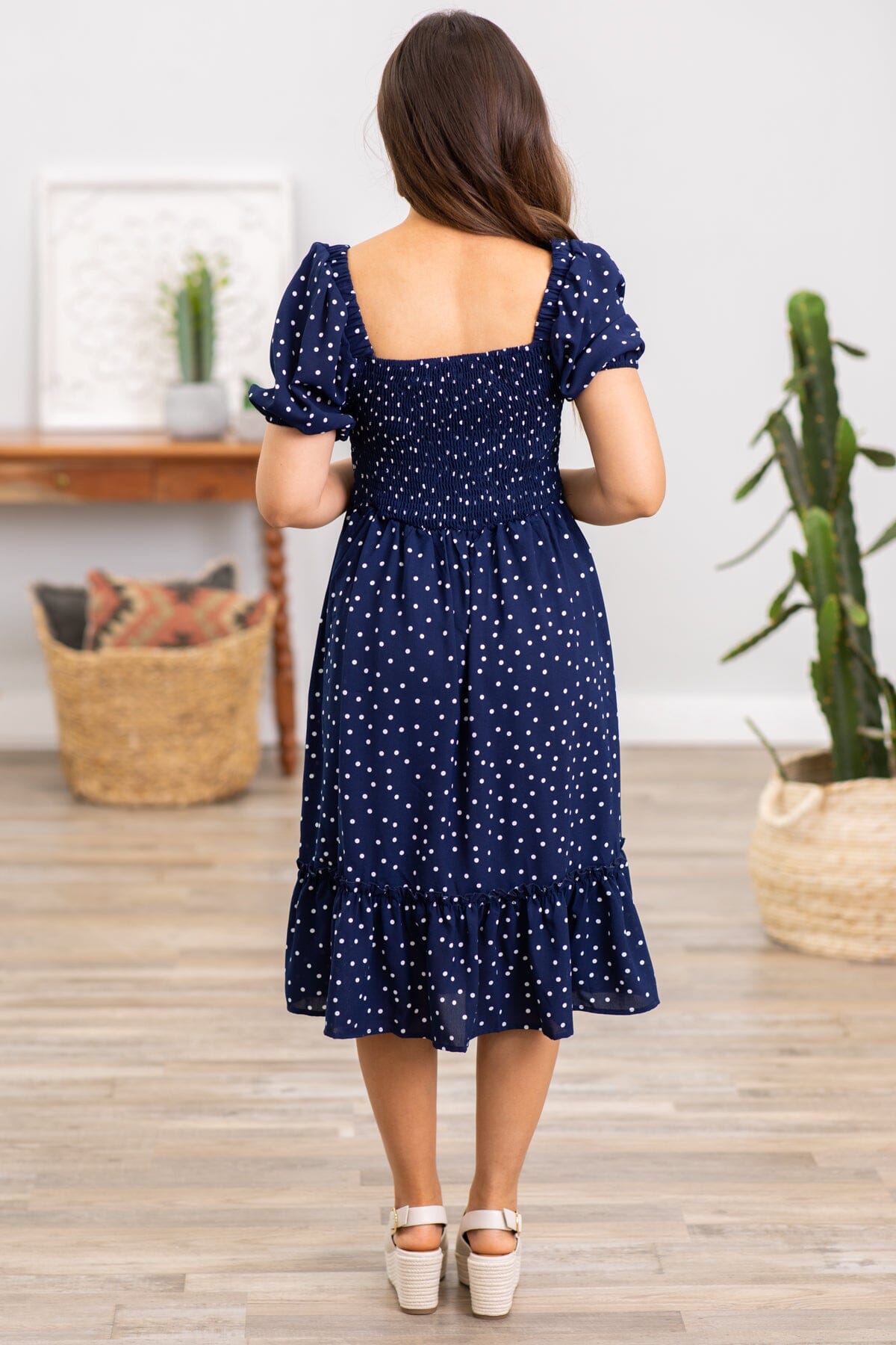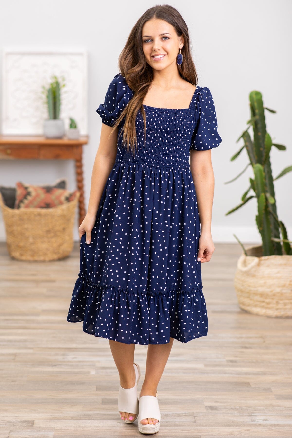 This dress is so pretty. Love the navy background with the white polkadots. The fabric is great for spring and summer transition. I did size down to a medium on this one and the fit was great. I am 38dd and normally wear a large. The only thing was the sleeves were just a little tighter on the elastic in the arms. That can be fixed though. Other than that, itโs a beautiful dress.