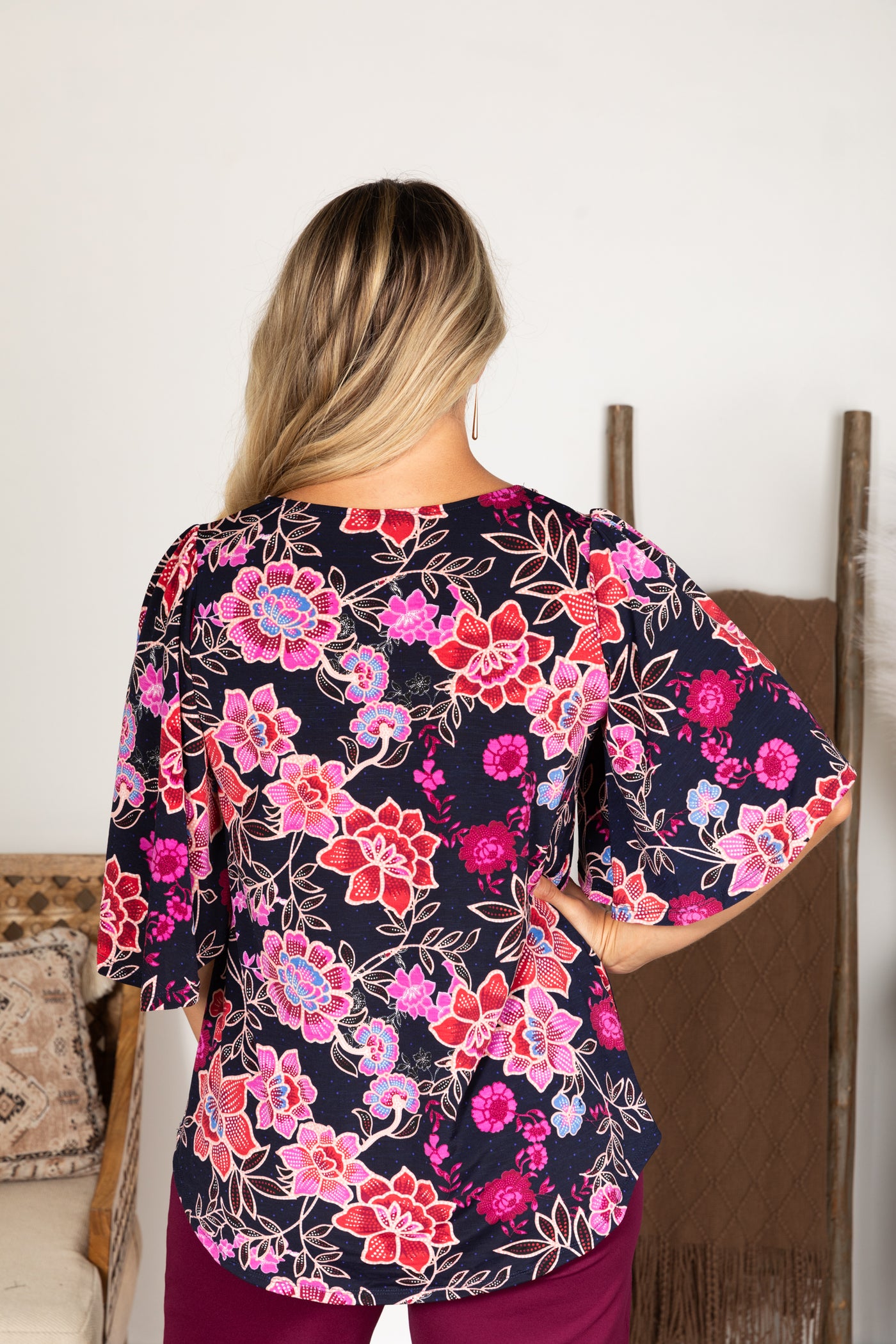 Navy Floral Dolman Sleeve Wrinkle Free Top