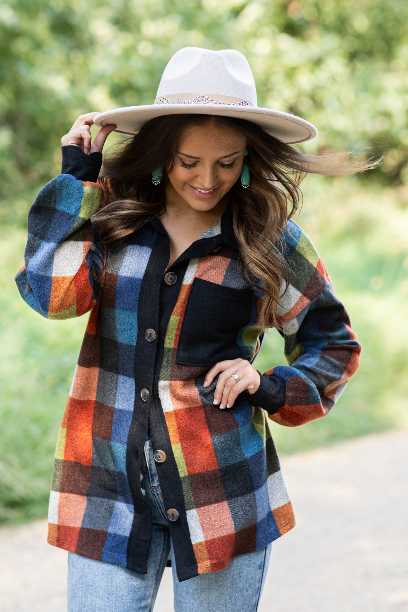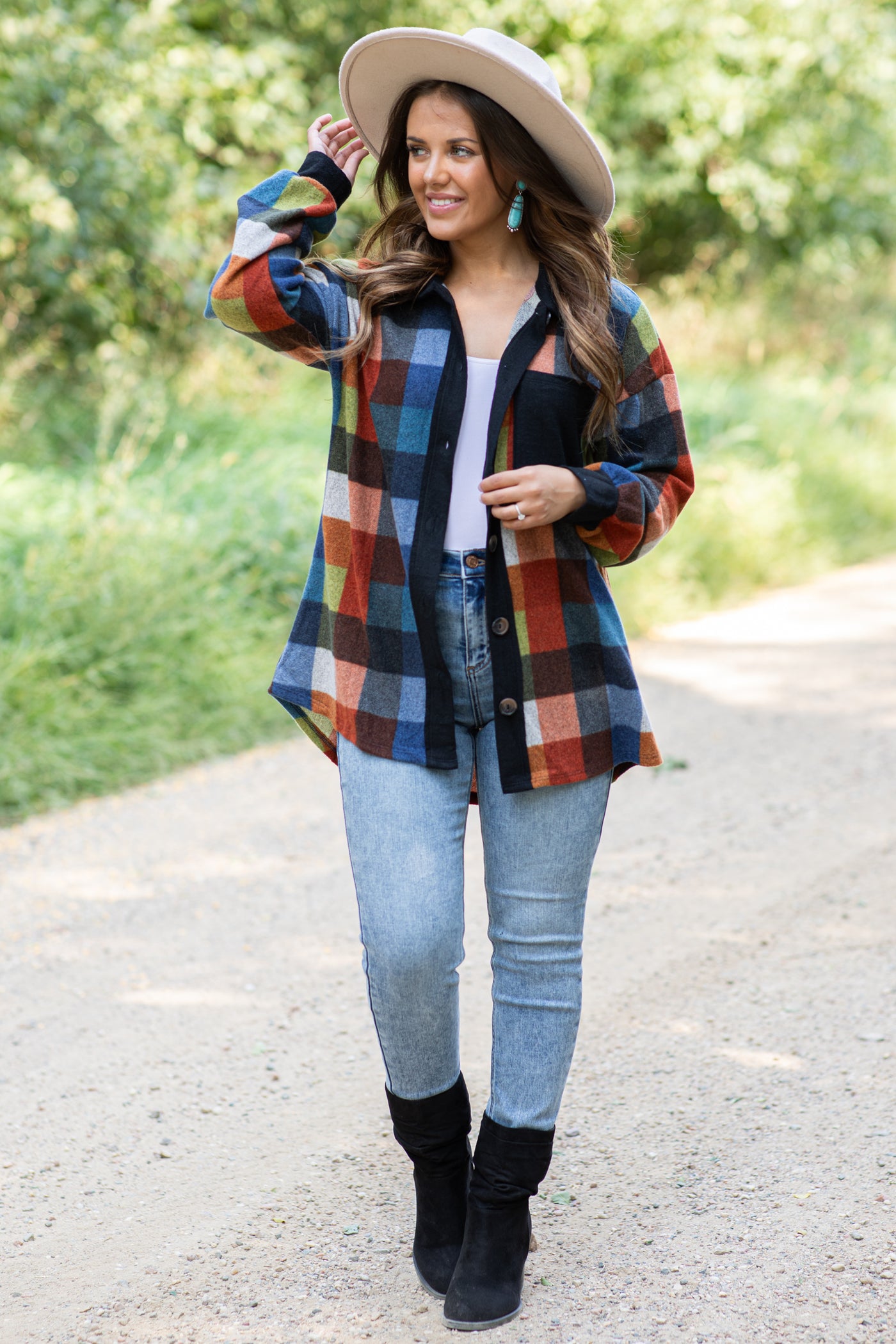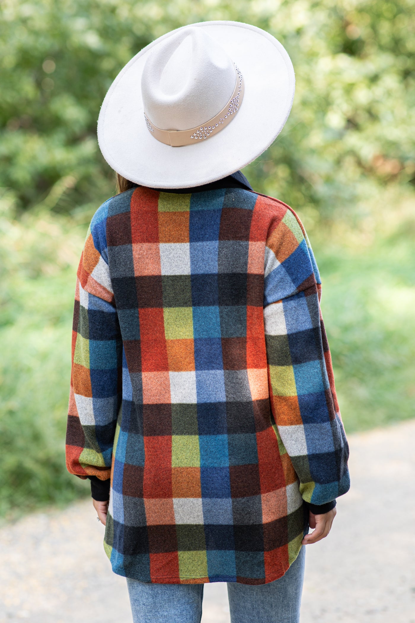 Navy Multicolor Plaid Knit Lightweight Shacket