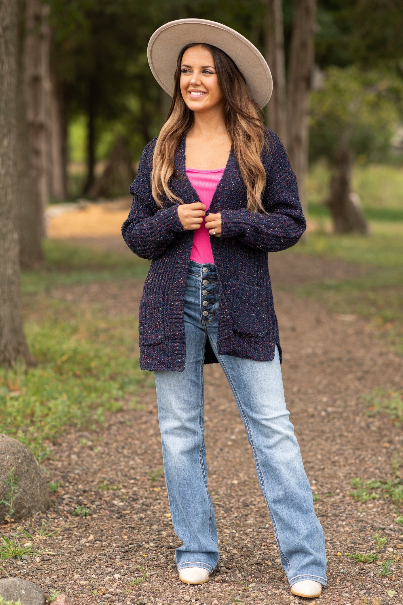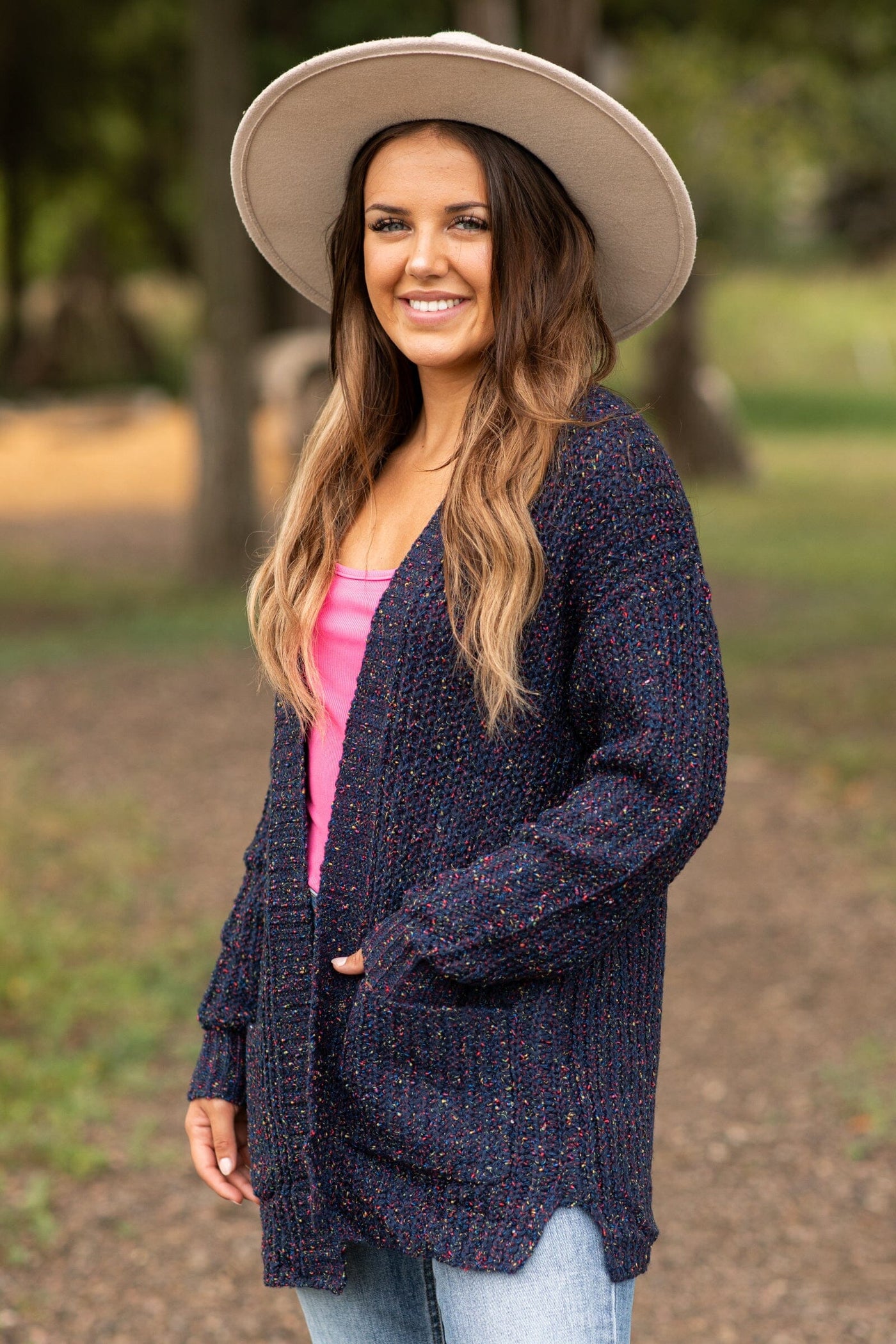 This is a nice basic cardigan to have in your closet. The slight splashes of color on the navy are pretty. Perfect length. Unfortunately I am not a fan of the thick knit material, which is not soft or stretchy. Fits true to size.