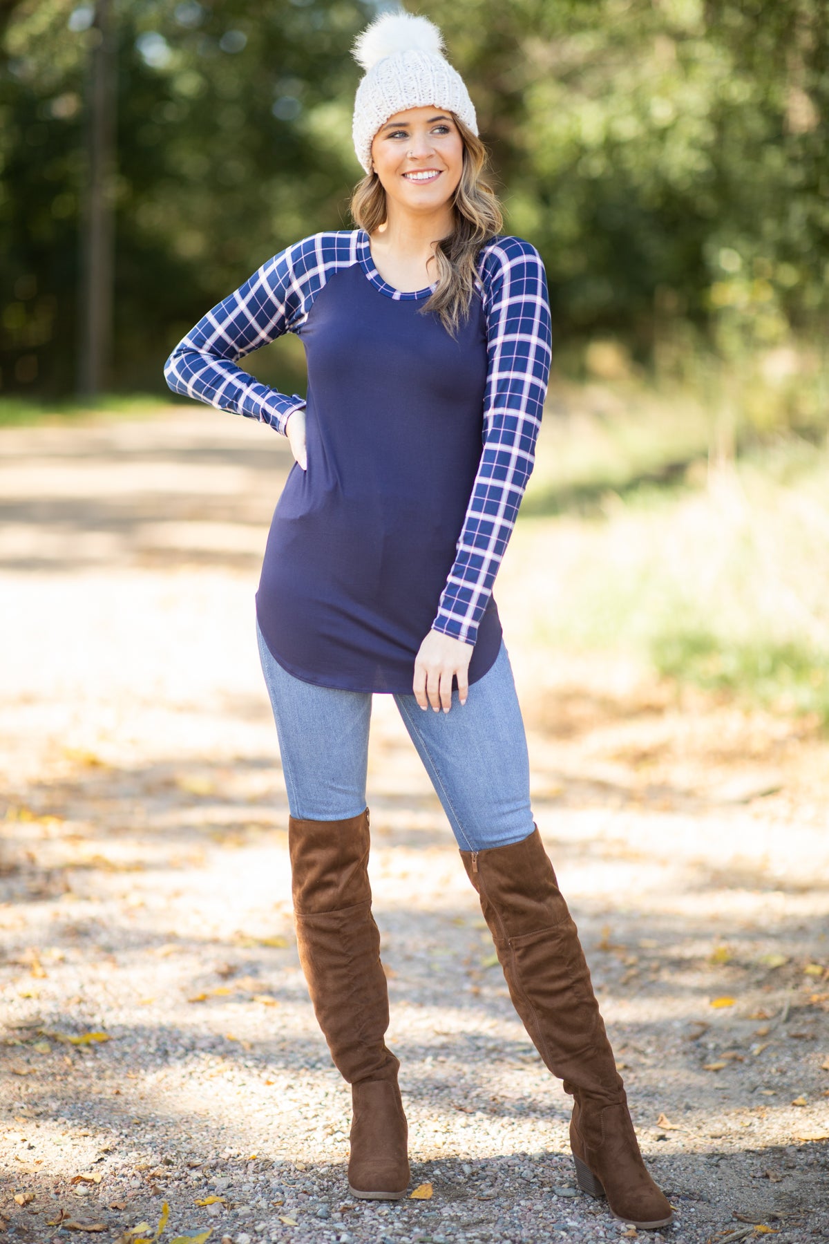 Navy Plaid Sleeve Top