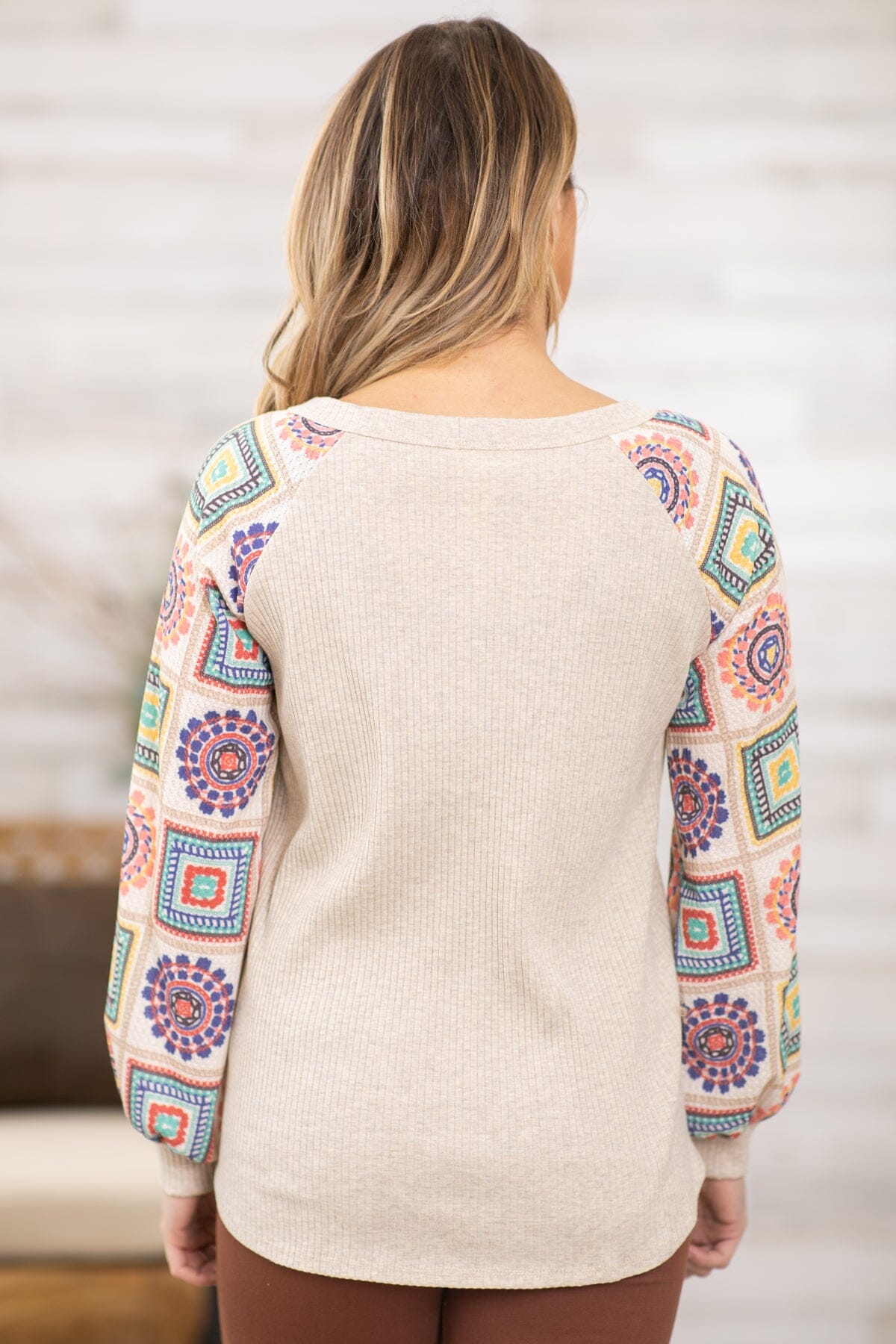 Oatmeal Multicolor Geometric Print Sleeve Top