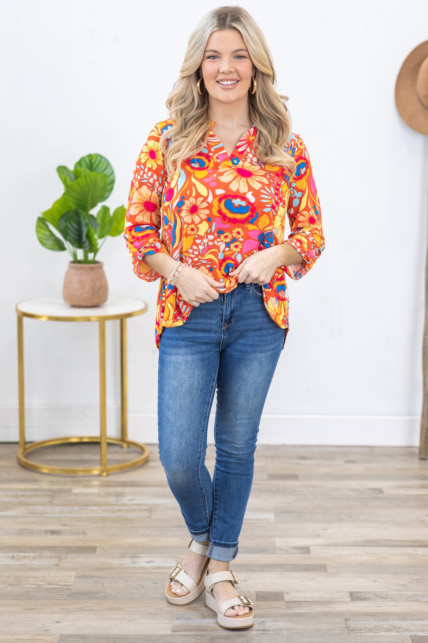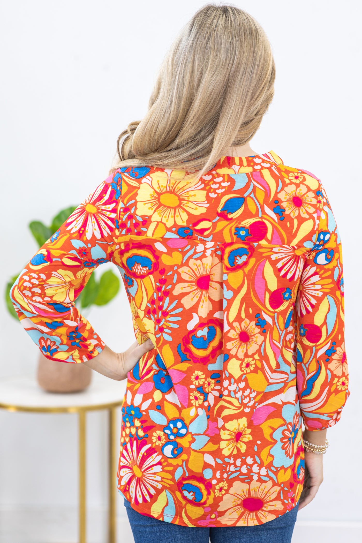 Orange Floral V-Neck Wrinkle Free Lizzy Top
