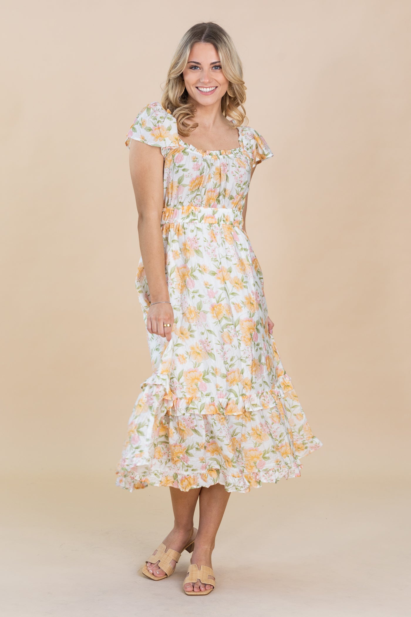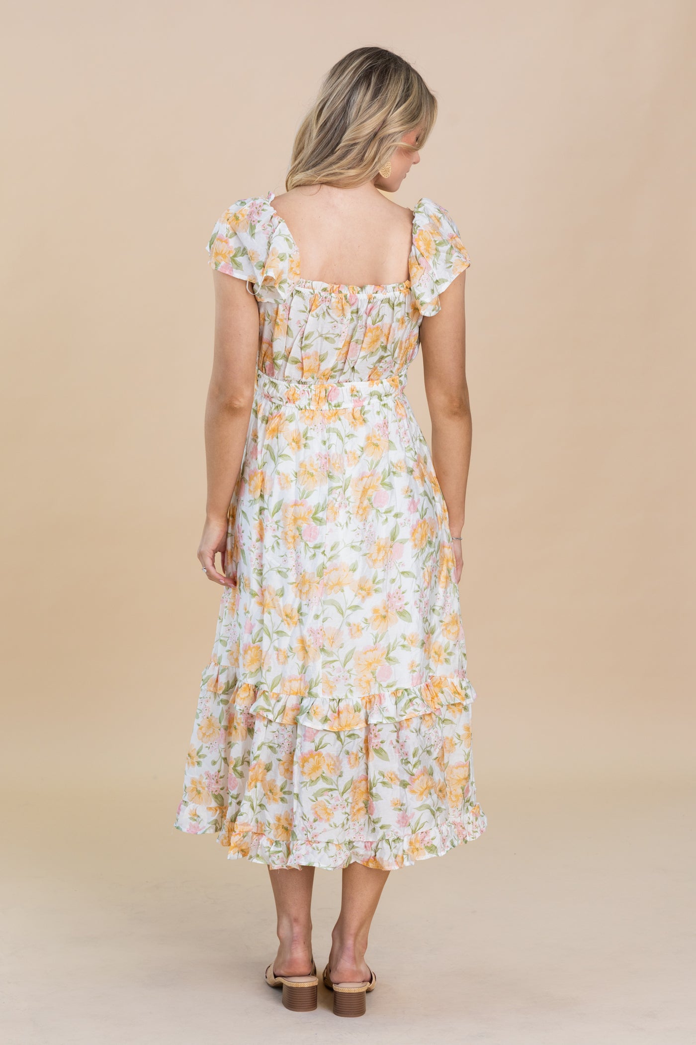 Peach Floral Short Sleeve Ruffle Midi Dress