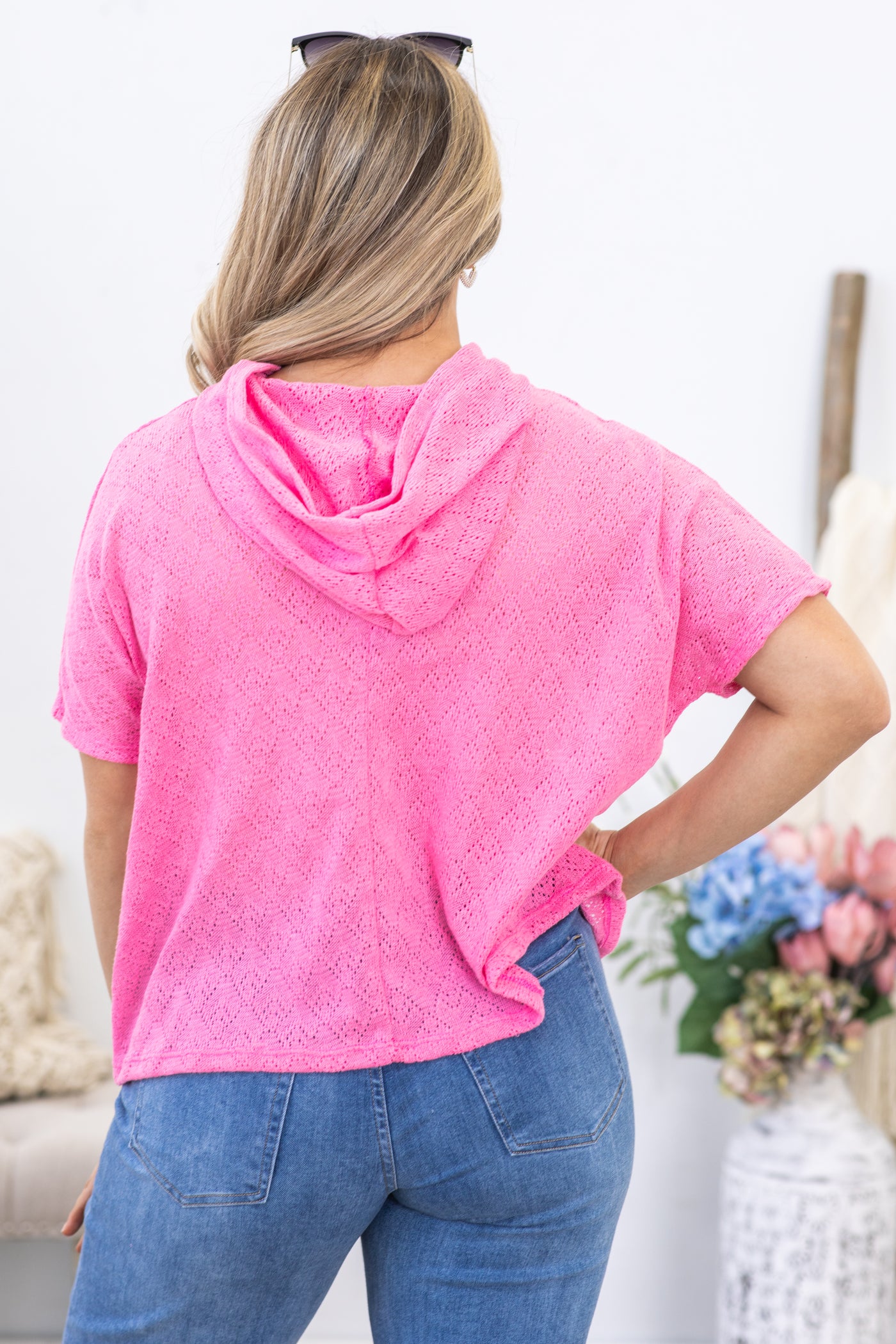 Pink Pointelle Knit Hooded Top