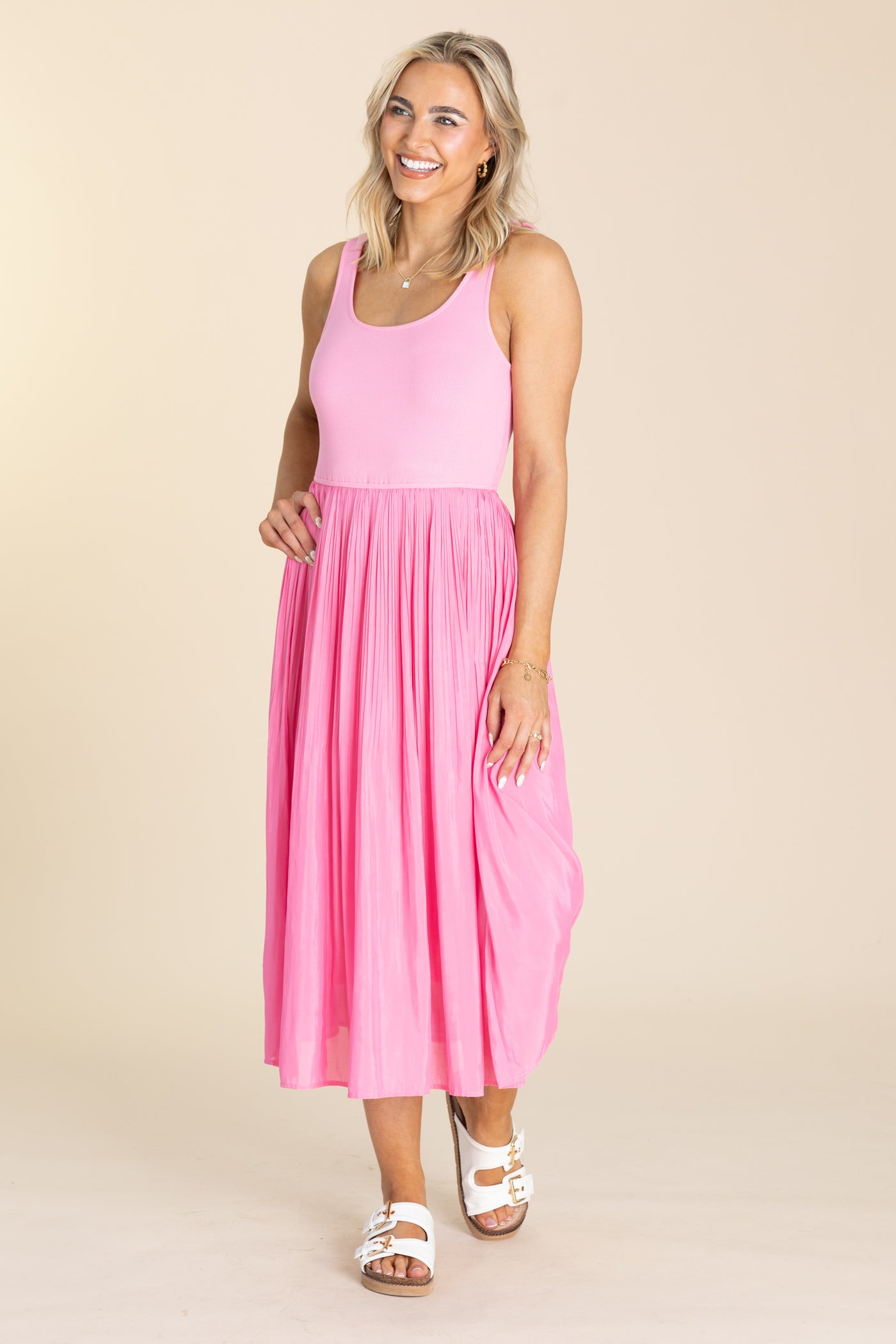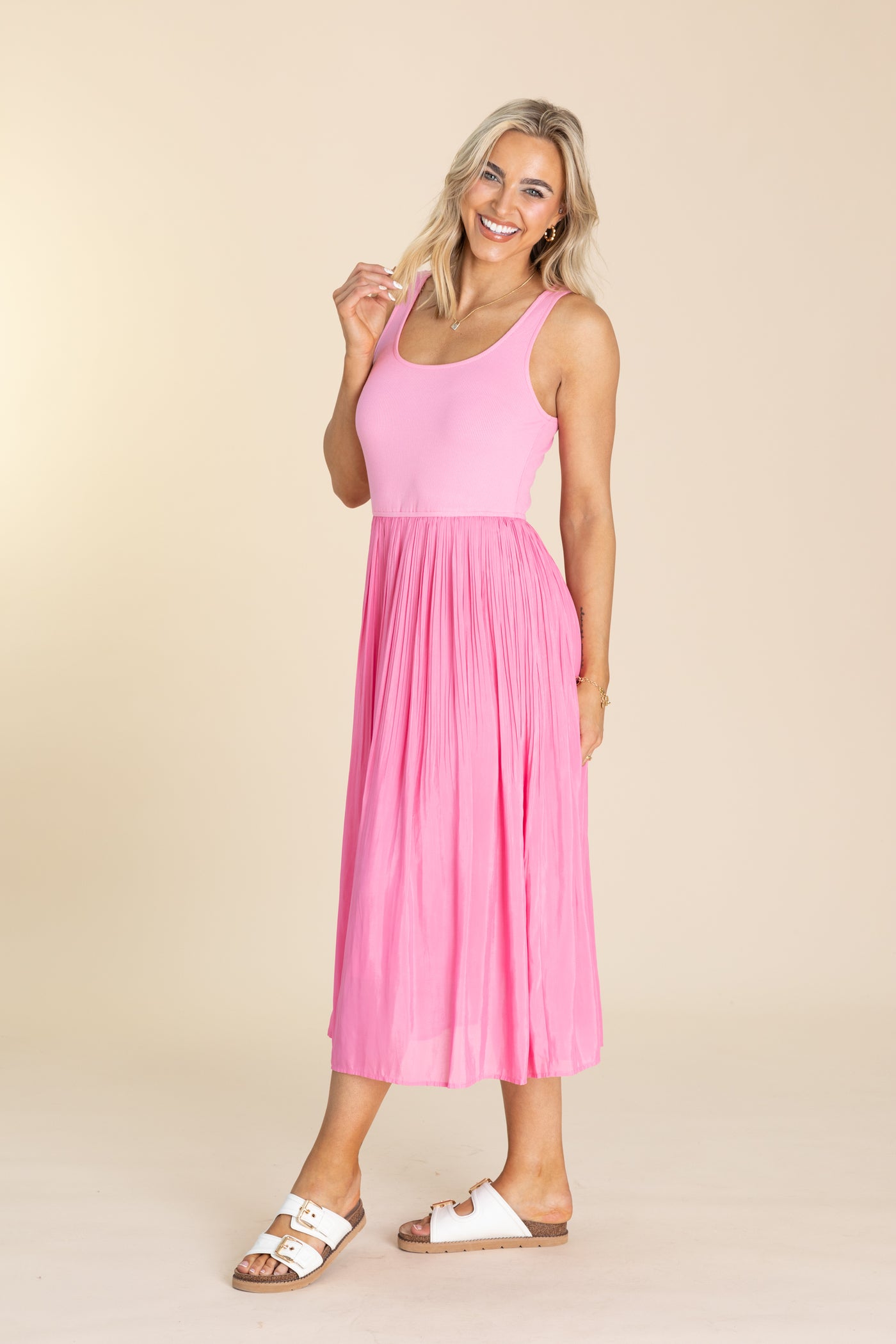 Pink Scoop Neck Pleated Skirt Tank Dress