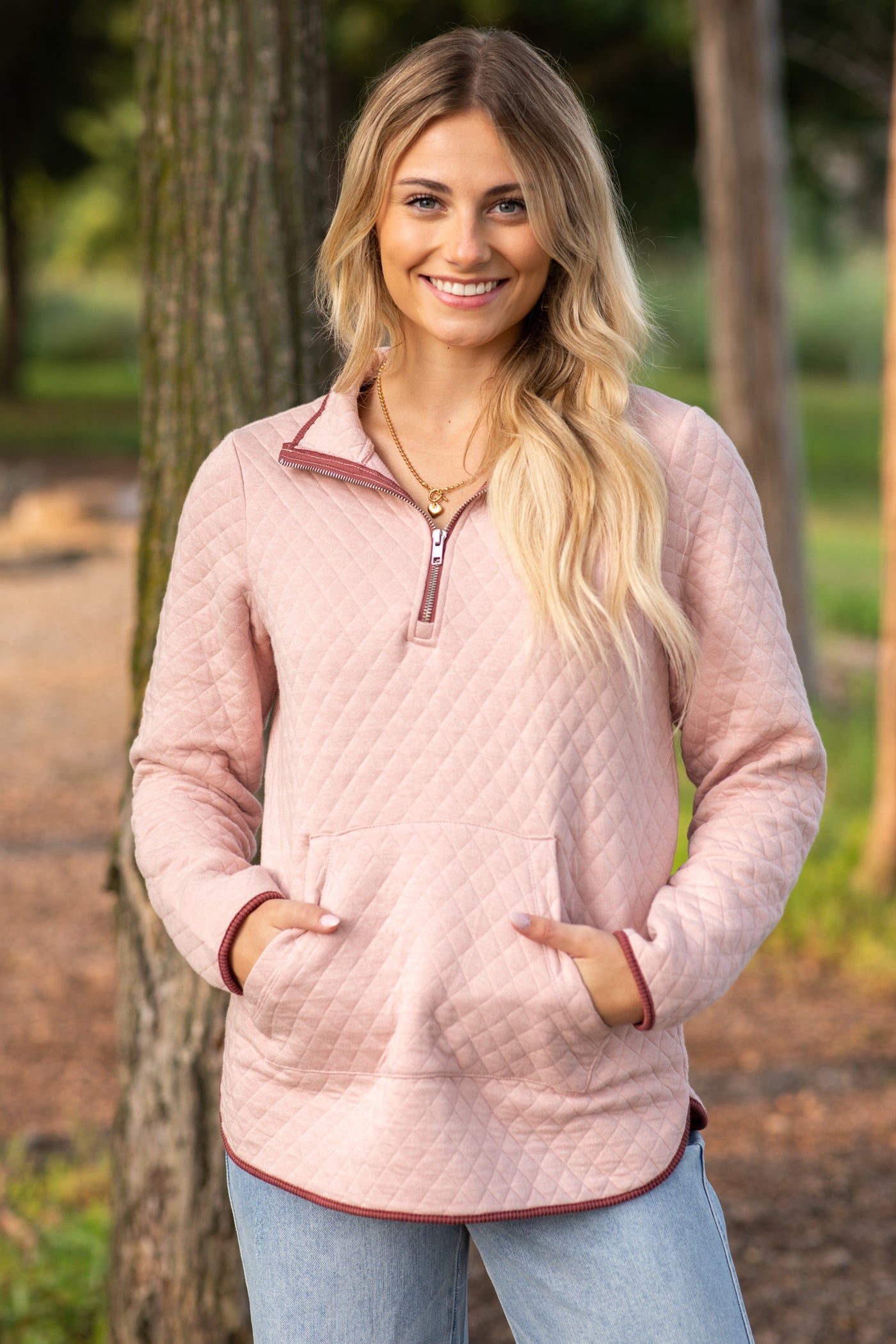 This cozy Staccato quilted pullover will be one of your new favorites for fall! It fits true to size (S- 2/4, M- 6/8, L- 10/12) and features a contrast trim that compliments the main color of the quilting.