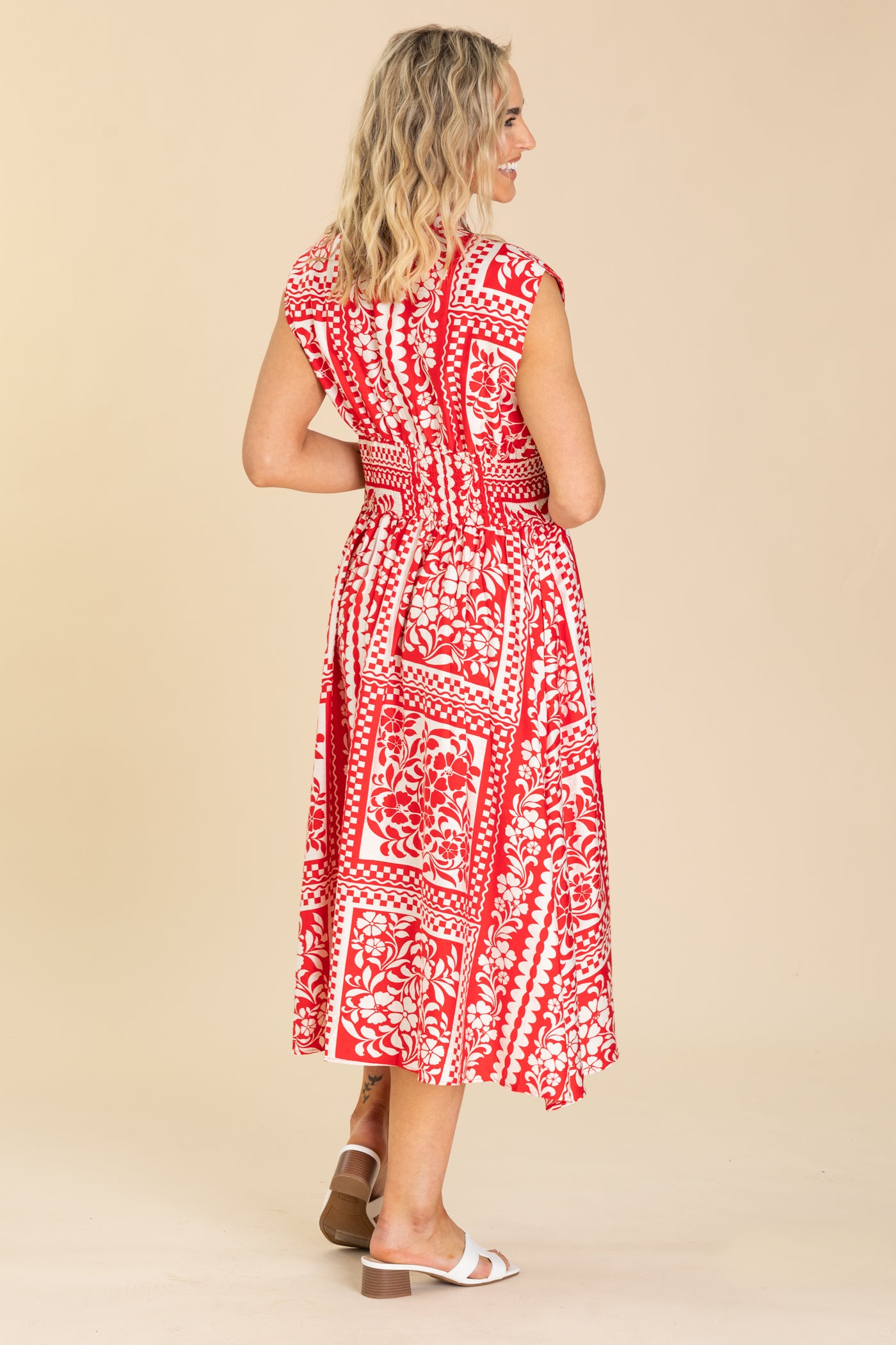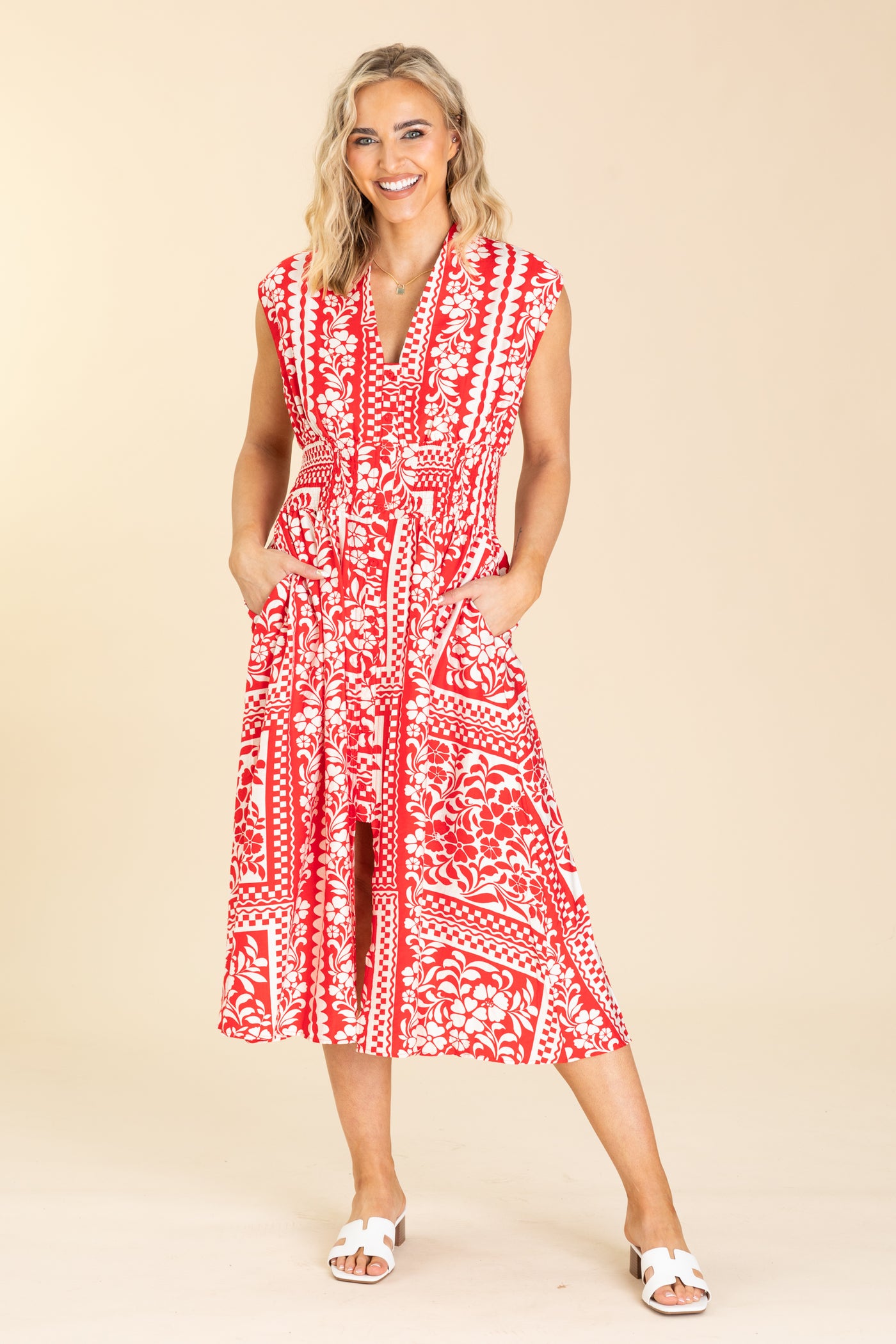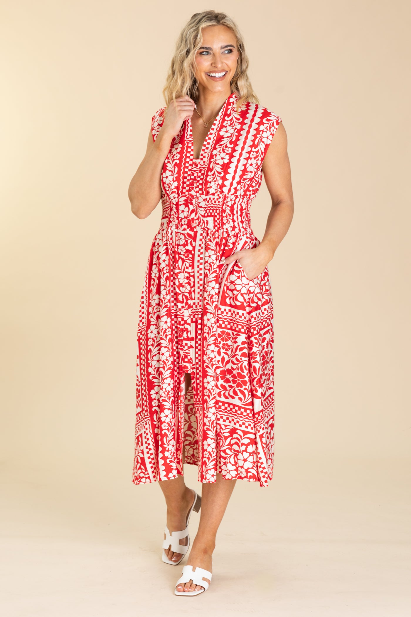 Red And White Floral Button Up Midi Dress
