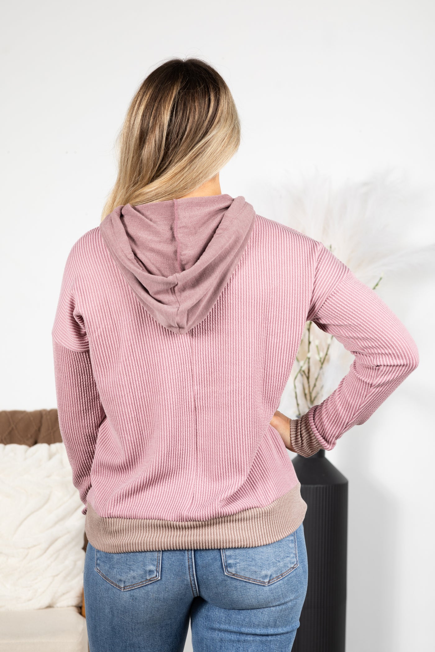 Ribbed Drawstring Hoodie Knit Top With Pocket