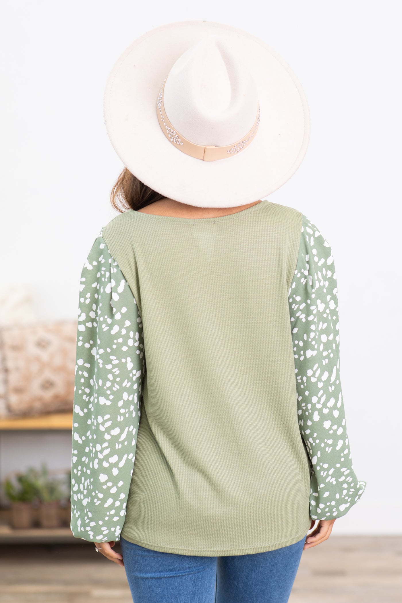 Sage Top With Animal Print Balloon Sleeves