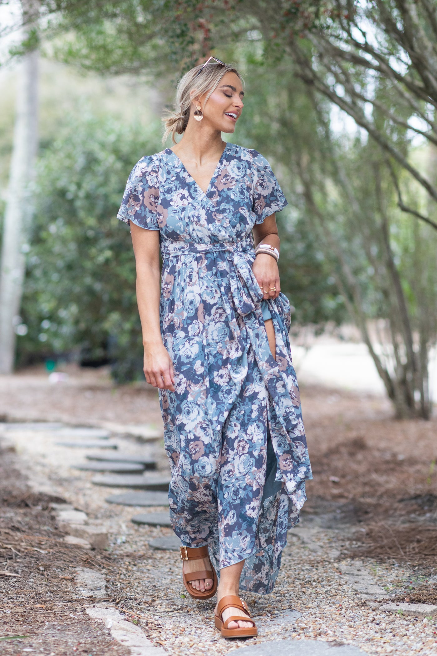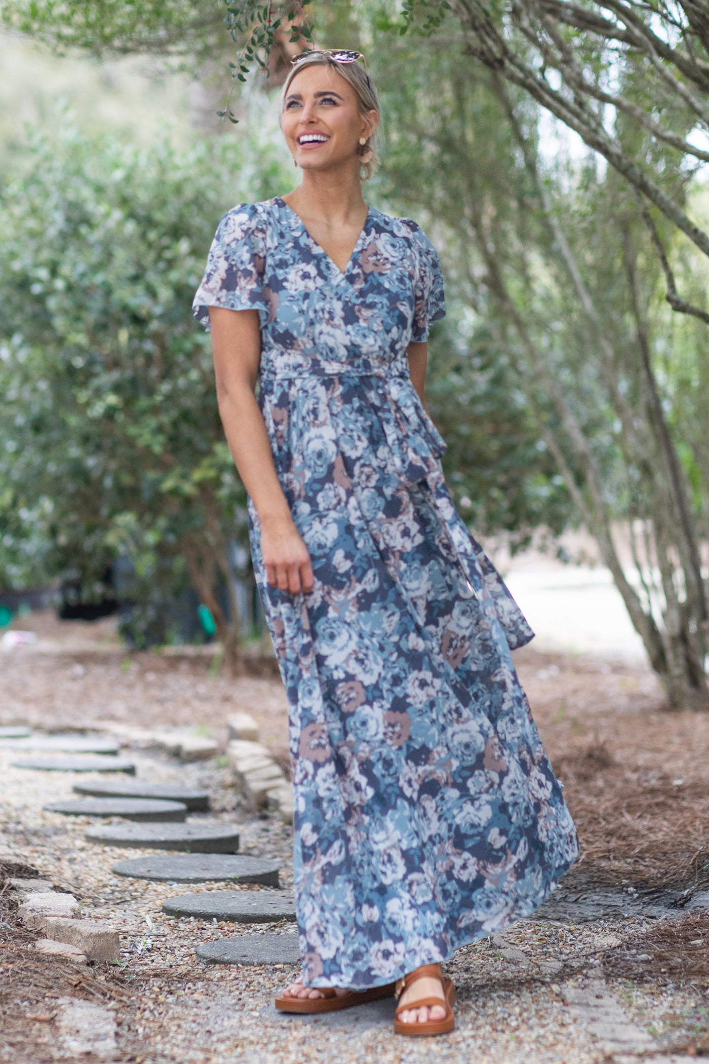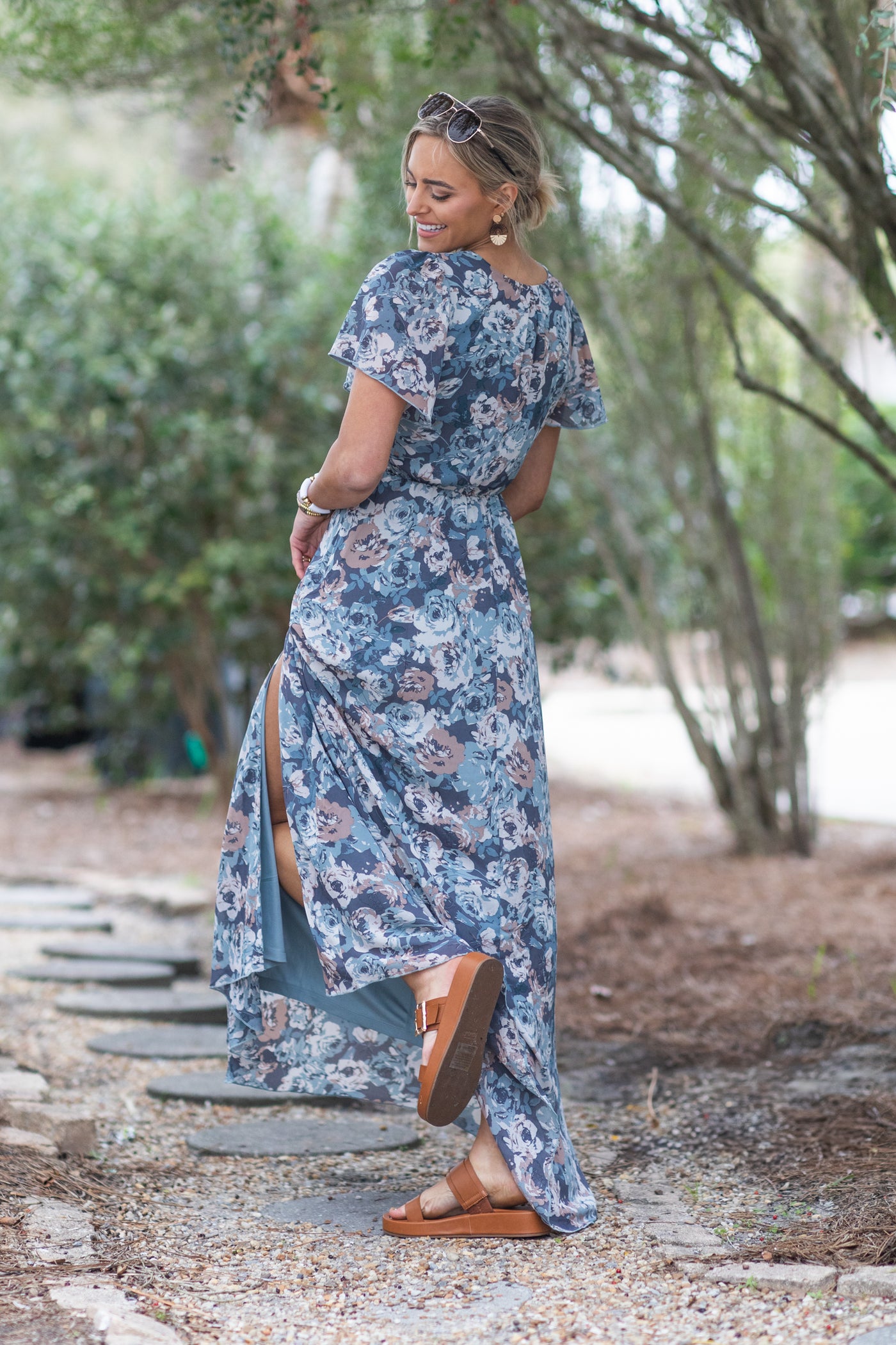 Slate Blue Blouse Floral Waist Band Maxi Dress